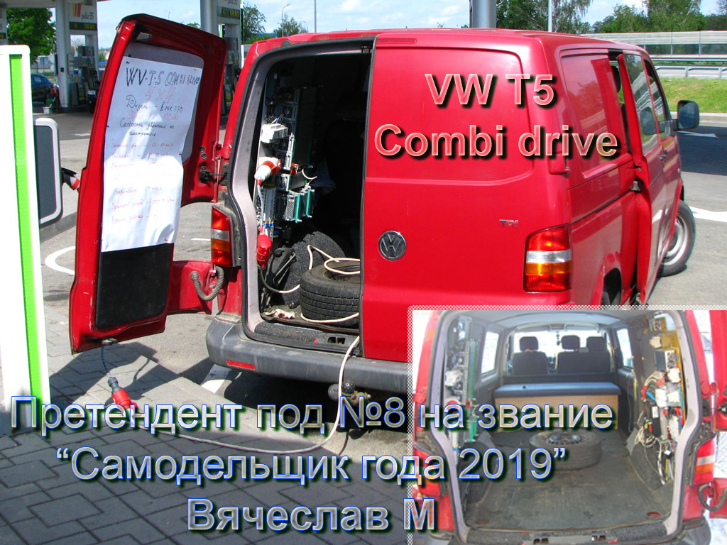ТРЕТЬЕ МЕСТО за VW T5 Combi drive получает Вячеслав aka Вячеслав М! Это один из самых уникальный минибусов страны. В нём используется комбинированная силовая установка: передние колёса вращаются от штатного дизельного двигателя а задние от электрического. Такое построение позволяет ездить в трёх комбинациях включенных двигателей: включены все, или включен один из них. Конструкция позволяет заряжать аккумуляторы при движении от дизельного двигателя путём рекуперации электрического. Мощность зарядки на борту 22 кВт. Элеткромобиль уже проехал более 100тыс.км., в том числе и за границей.