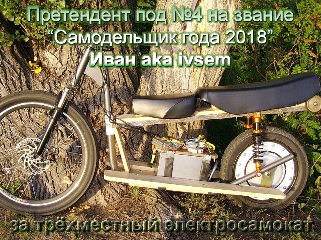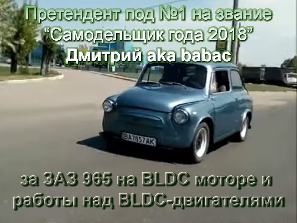I место с большим отрывом занял Дмитрий aka babac за ЗАЗ 965 на BLDC моторе и работы над самодельными BLDC-двигателями. Эти работы дали новый толчок самодельному производству электродвигателей большой мощности на постоянных магнитах. Ему вручена награда-статуэтка "Самодельщик года 2018" и денежный приз в размере 1653 грн., который победитель уже потратил на токовые измерительные клещи.