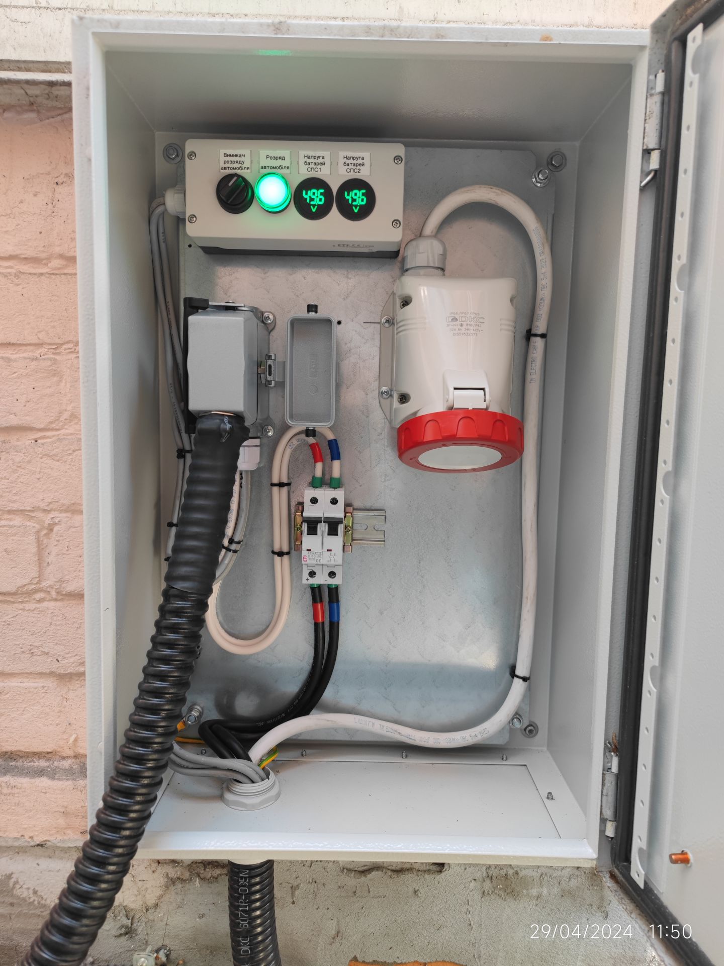 Коментарій до файлу: Кабель від машини підключається в цей щит. В ньому контроль заряда батарей. Все зроблено так, щоб не ходити в приміщення і там нічим не клацати, щитки не чіпати і взагалі нікуди не лізти. Щит буде дообладнано кулонометром з Аліекспресу, щоб ми могли рахувати кількість кВтг, злитих з авта.