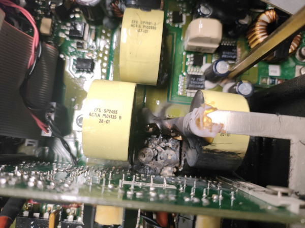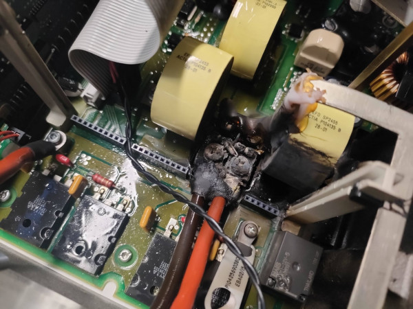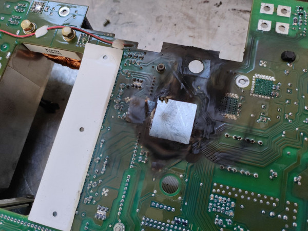 Niestety, uszkodzenia płyty z obwodami są tak duże, że nie wiem czy uda się naprawić. Są spalone ścieżki między elementami. W niektórych miejscach ścieżkio odeszły od płyty z obowodami, w niektórych oczka/punkty lutownicze odpadły.