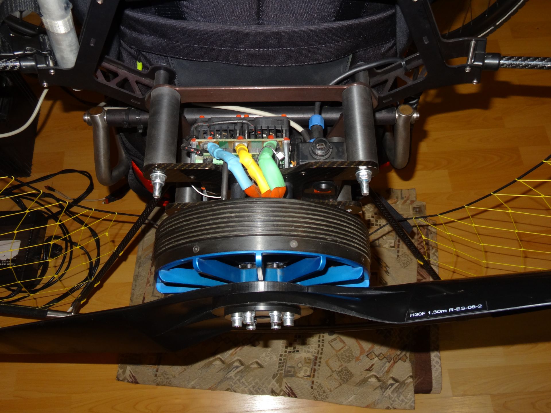 Была использована стандартная скаймаксовская парамоторная рама с подвеской «SupAir». Батарея размещается в сумке на месте бензобака.