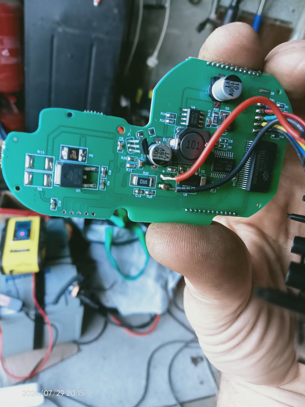 Але цікава система роботи. Ще такого не зустрічав, а може не попадало. На червоному проводі в пульті - напруга акума 54в. Після того, як включиться кнопкою - падає на 12в до 42в. По цифровій шині - жовтий і зелений - цифрові дані з мінусовою амплітудою відносно чорного масового проводу дисплея. На виході дисплея по живленню також 42в.