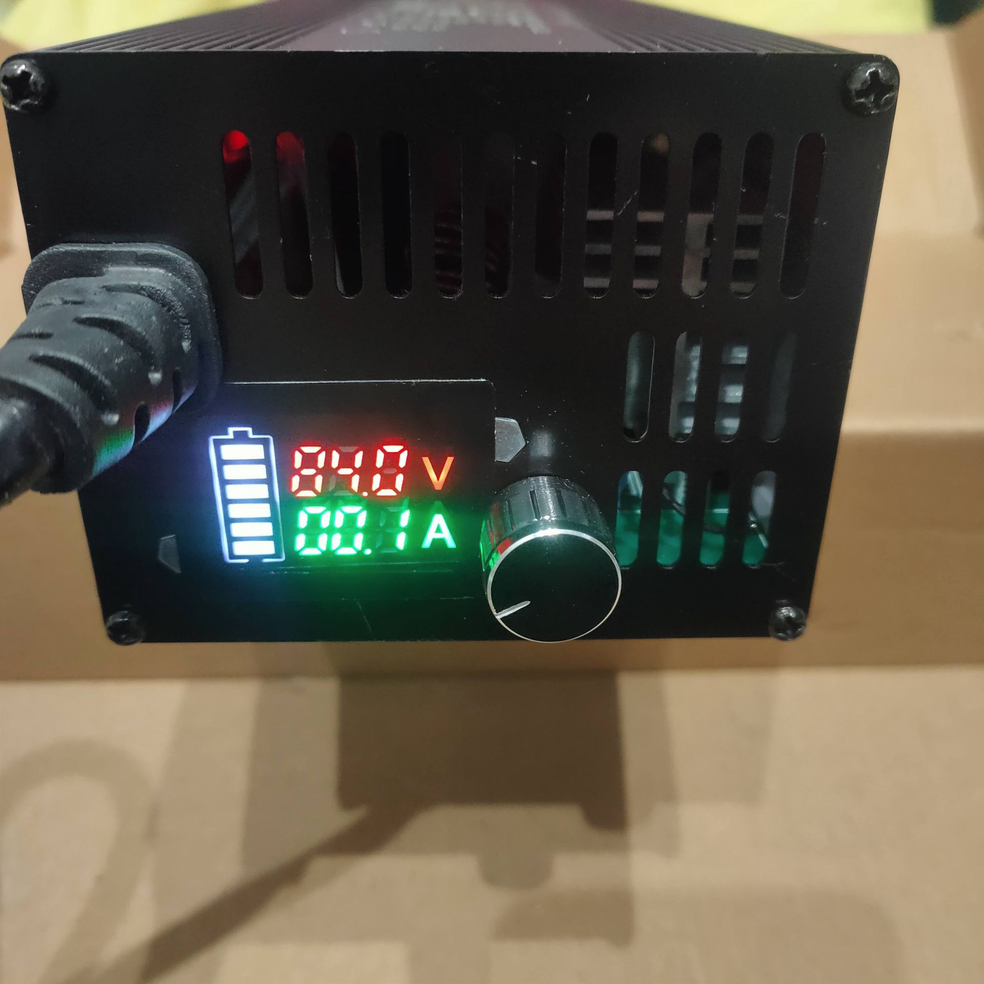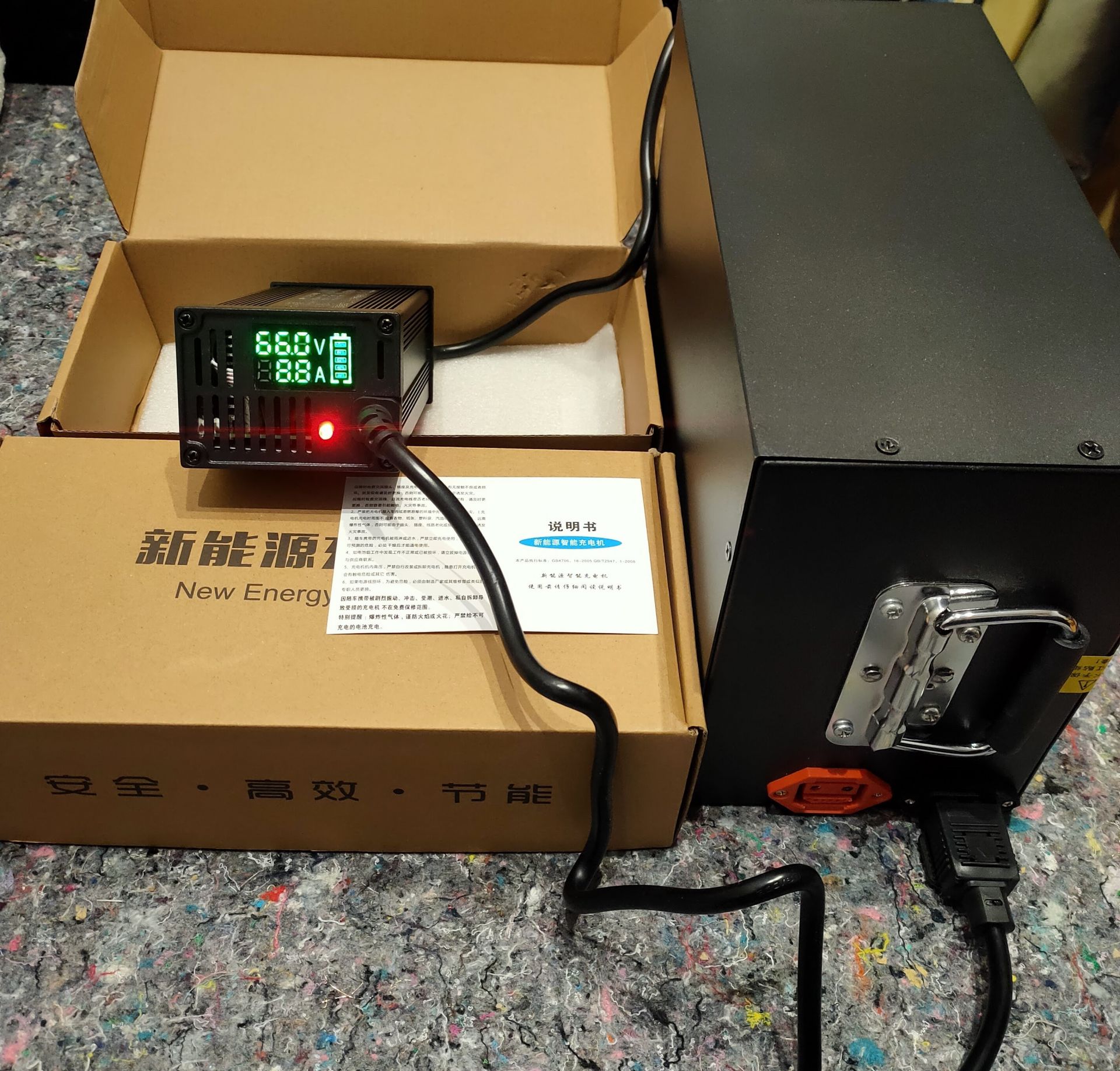 Новое зарядное устройство для электротранспорта с питанием батареи 60 Вольт 16S (в полном заряде 67.2 вольта) с возможностью регулировки по току от 1 до 10 Aмпер максимум 670 Ватт. Имеет систему охлаждения в виде вентилятора, корпус алюминиевый. Зарядное устройство имеет дисплей в виде показателей тока, вольтажа и уровня зарядки батареи. Ручка регулировки тока от 1 до 10 Ампер. Питание универсальное от сети 180-240 вольт в комплекте качественный Евро переходник под все типы вилок MarKen.