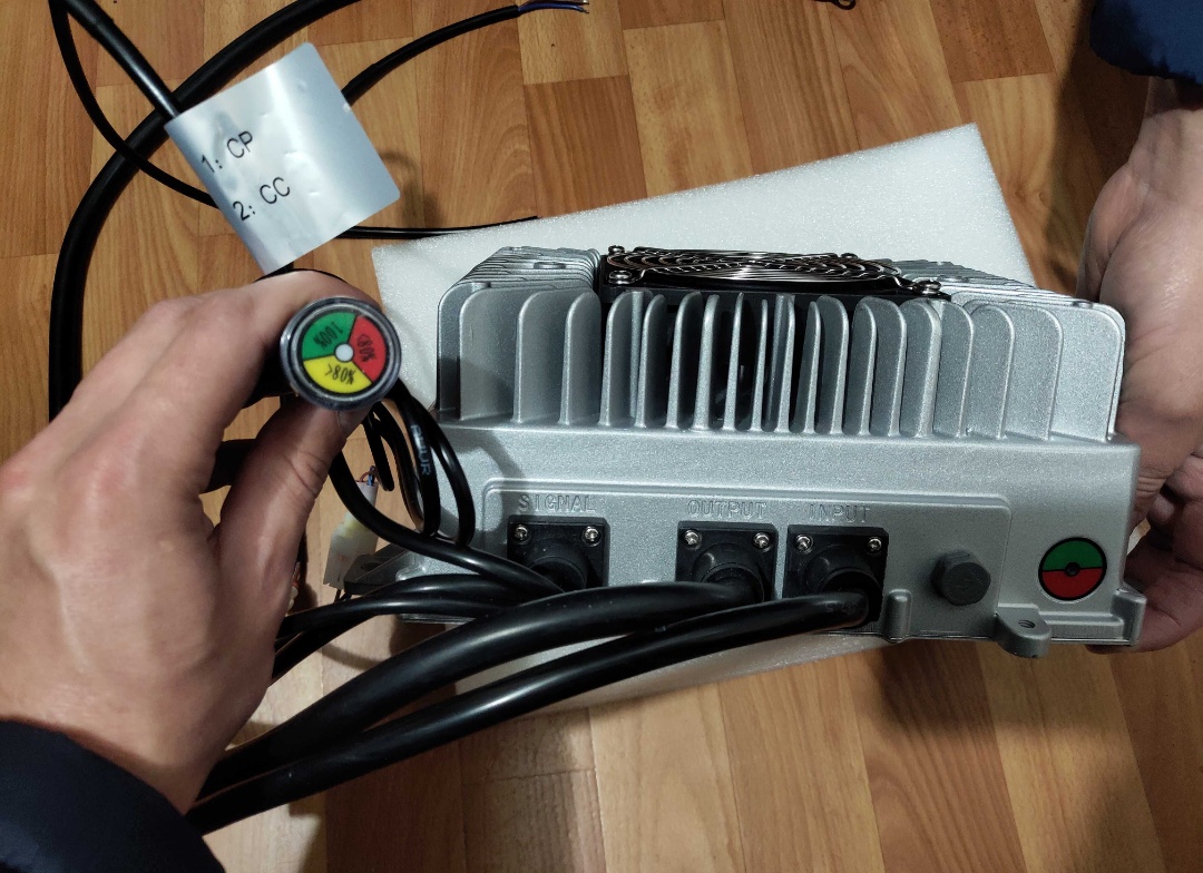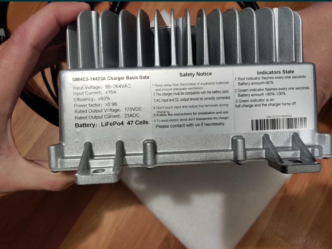 Входное напряжение 90-264В. Входной ток до 16А. Выходное напряжение номинальное 144В, максимальное 170В. Ток зарядки до 23А. Мощность 3.6квт*ч.