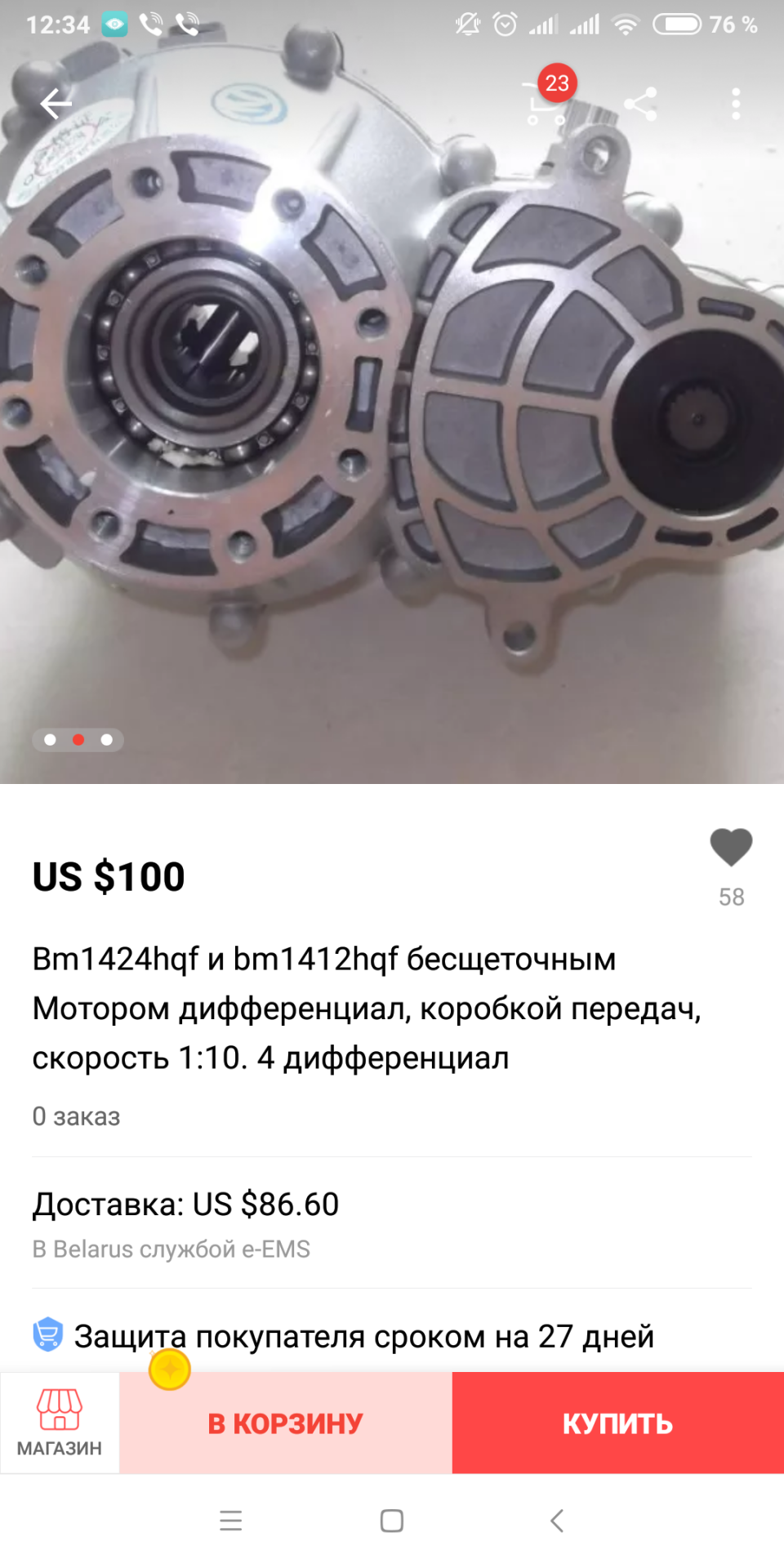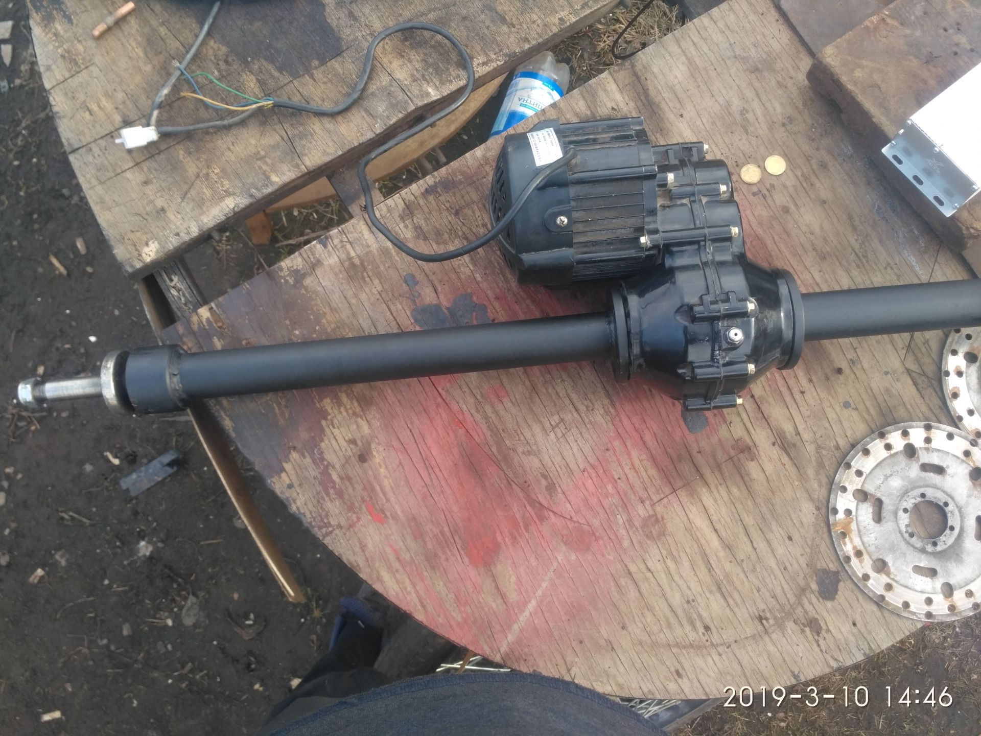 Комплектация: мотор, редуктор, полуося, чулки, тормозные диски, колеса и контроллер. На 50в 300 оборотов после редуктора ~30км/ч.