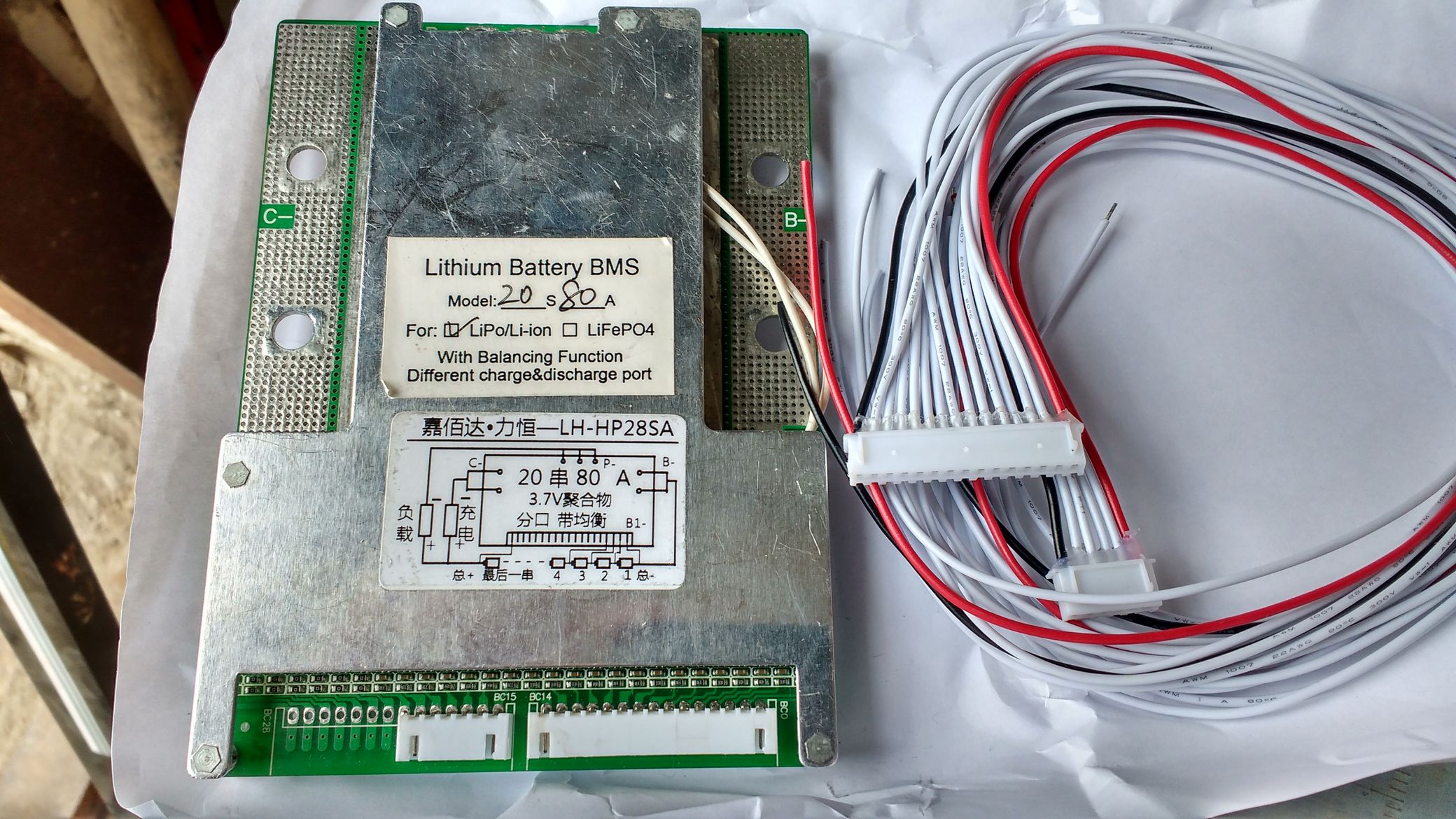 Вітаю! Є в наявності бмска, виявилась зайвою мені (поставив іншу). Розрядний струм 80А, зарядний невідомий, але я її тестував 20А - заряджає, не дуже гріється. Якщо заряджати таким струмом то краще ставити ззовні корпуса АКБ для охолодження. Якщо меньшим струмом то можна всередину. Є світлодіоди на кожен канал, світятся коли канал заряджен майже повністю і там почалось балансування, тобто світяться коли струм заряду на канал подається через резистор. Який саме струм балансування не знаю, але ймовірніше щось стандартне, десь ~50 мА. Є датчик температури - можна засунути його всередину АКБ та мати контроль за температурою з боку БМС. Відрубає навантаження коли одна з ячейок досягає 2,75В. Починає балансування коли напруга підходить до 4,2В. Віддам за 60 у.о. Може комусь знадобиться. Є подряпини на алюмієвому радіаторі, це видно на фото - на роботу звичайно не впливають.