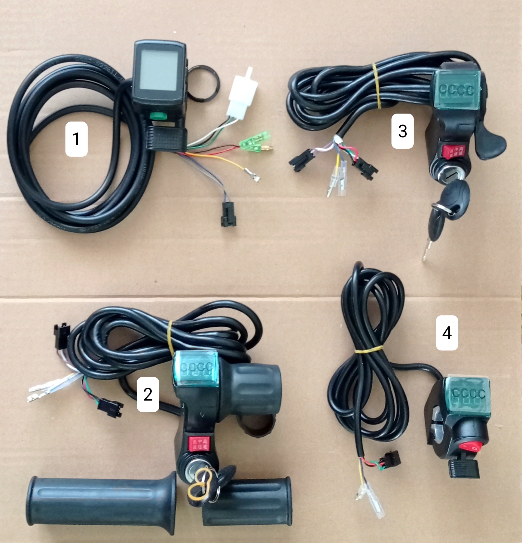 2. Ручка газу універсальна (12-85В) на праву сторону, половинка з двома змінними гріпсами, з вольтметром, з 3х позиційною кнопкою перемикання передач та ключем. Довжина шнура 1,5м.