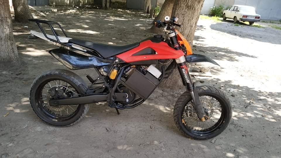Продаю электромотоцикл, выезжал пару раз, по сути, это первый в Украине электро-мотард. Мотоцикл переделан из бензиновой хаски sm125. Аппарат бомба, подрыв с места резвый, едет бесшумно, максималка 75-80 км/ч. Если поставить другую звезду, поедет под сотню. Едет хорошо, как по бездорожью, так и по асфальту, реально универсальный мот. Комфортно с пассажиром, удобная посадка. Для максимального бездора можно установить более злой протектор, напр mitas07, либо поменять колёса на эндурные.