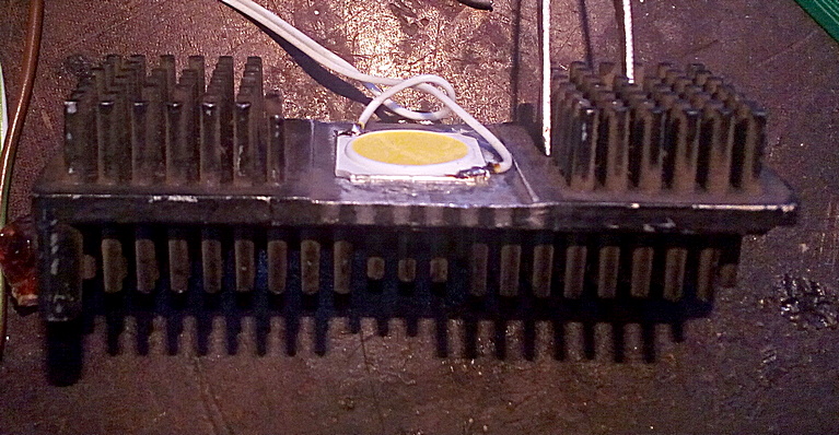 Светодиод на ~33 вольта был приклеен герметиком на середину радиатора размерами 10x3x3 см.