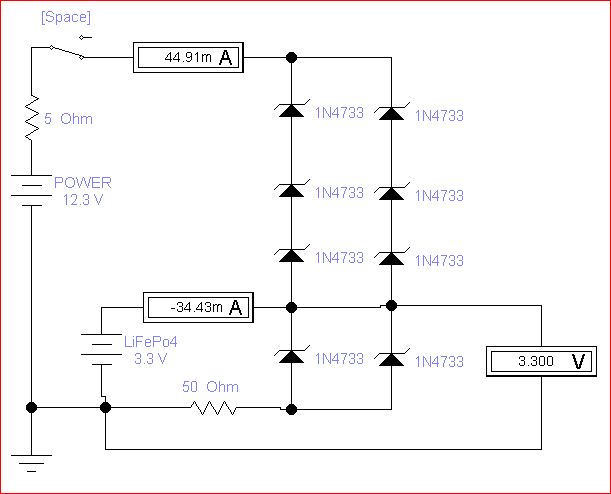 Первый скрин схемы из симулятора, на нем аккумулятор специально отключен чтобы показать верхнее напряжение которое попадает на аккум (оно настраивается путем изменения напряжения питания):