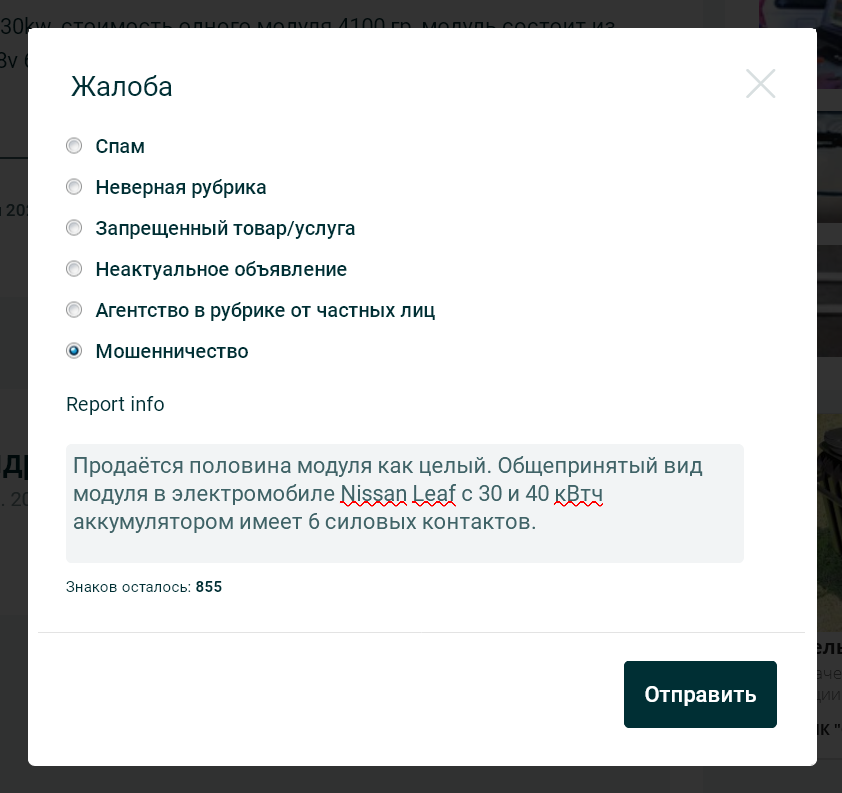 Объявление уже подправлено, но продавец по прежнему пытается пойти в разрез общепринятым понятиям ячейки 30-ки. Давайте всем клубом перейдём по ссылке https://www.olx.ua/obyavlenie/leaf-niss ... DUbzd.html нажмём под объявлением кнопку "Жалоба", далее выберем "мошенничество", далее текст, что мол продаётся разобранный, а не полный модуль. Я уже сделал:
