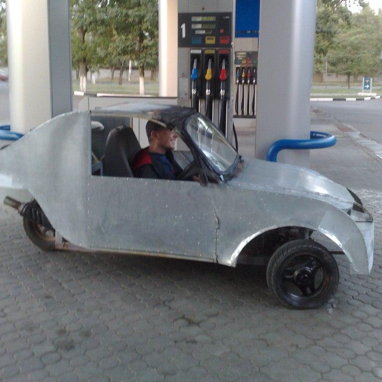 А это самодельный кабинороллер из Николаева выполненый по той же схеме как и кабинороллер из Винницы - задняя часть от скутера + передний мост, самодельный или от мотоколяски. Автомобиль сей предназначен для инвалида. Студент может еще изощриться в части дизайна.