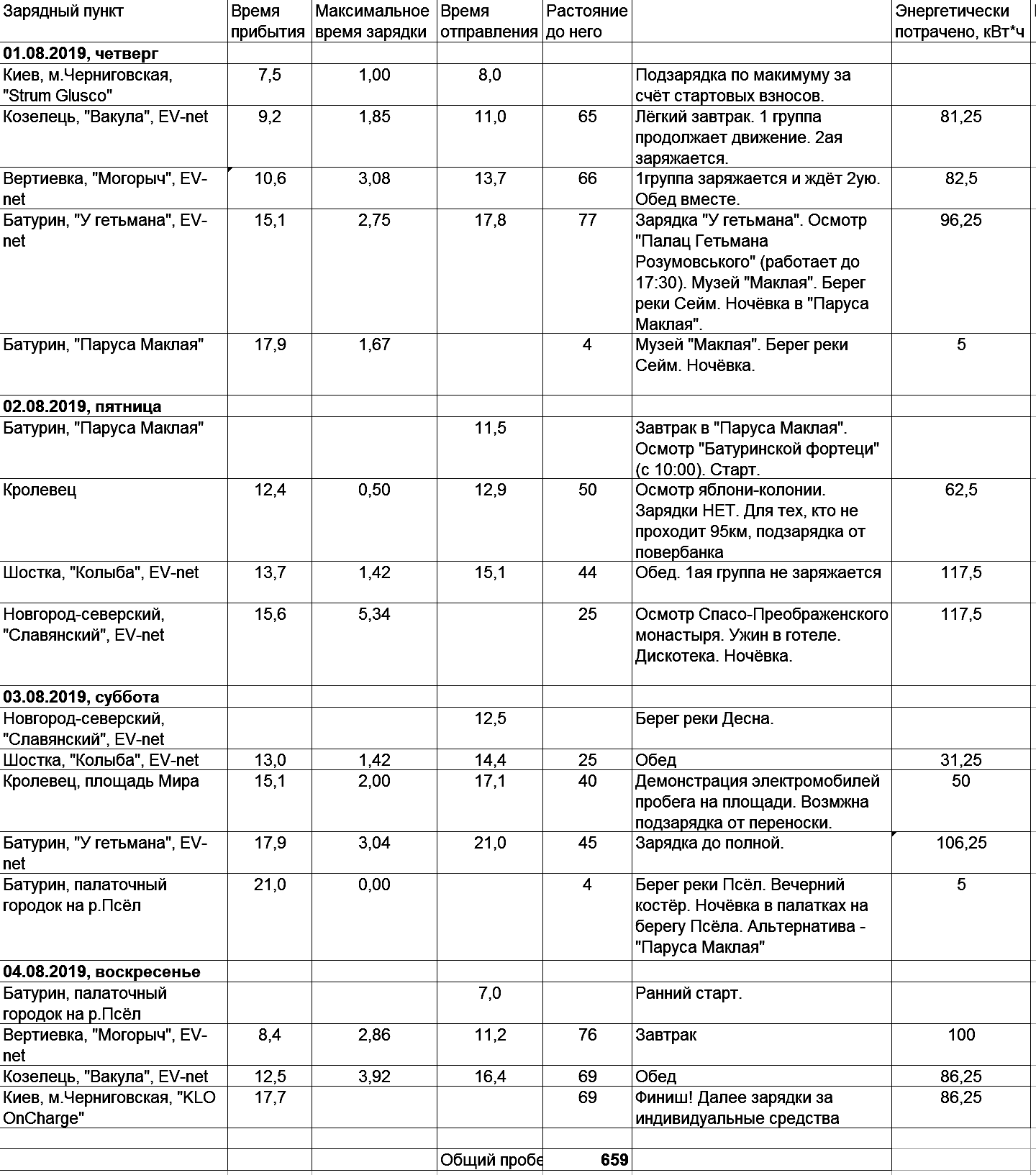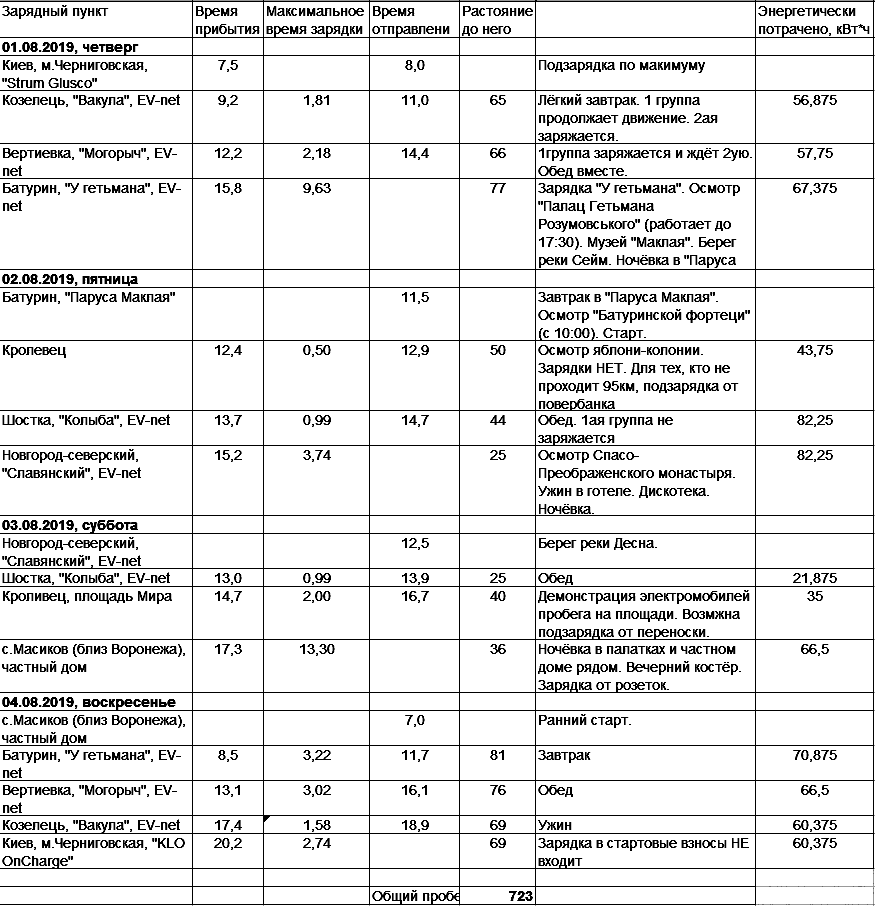 У нас чуть-чуть изменения по ночёвке в палатках. Всё таки в Воронеже не сильно живописно, поэтому решено всё таки поехать в Батурин и переночевать там на берегу речки Псёл в мини-палаточном городке. Итоговая таблица пробега:
