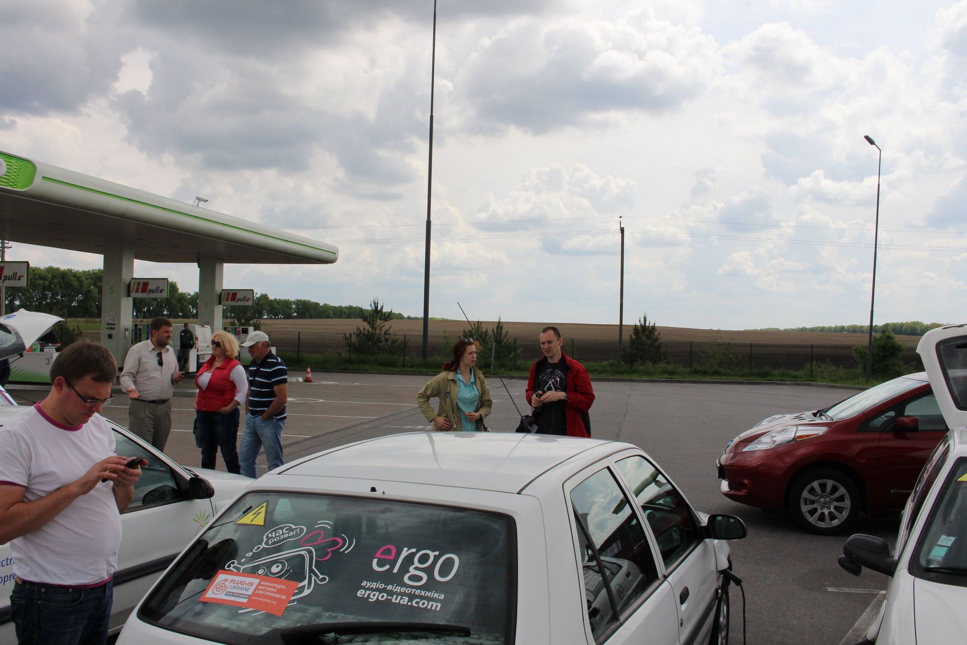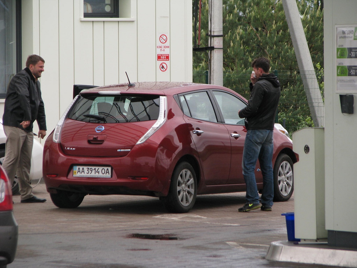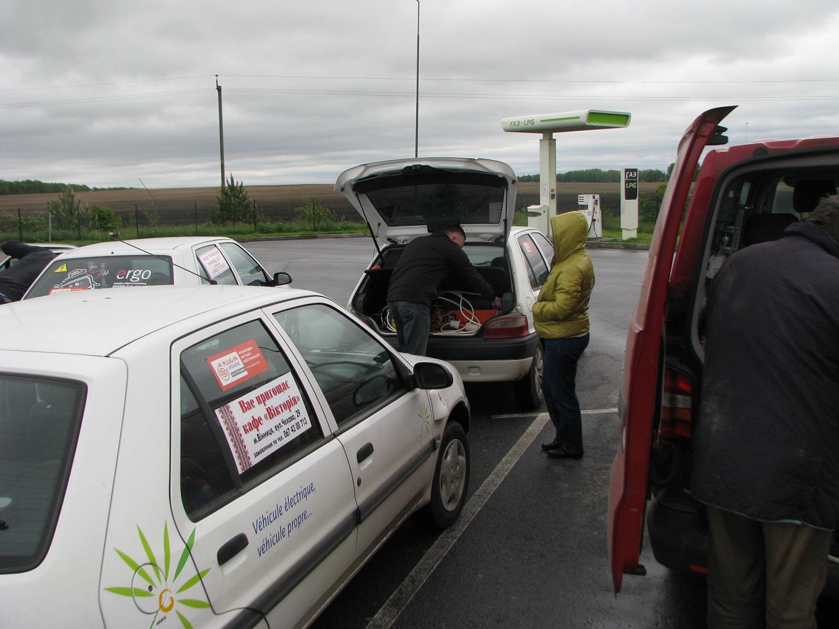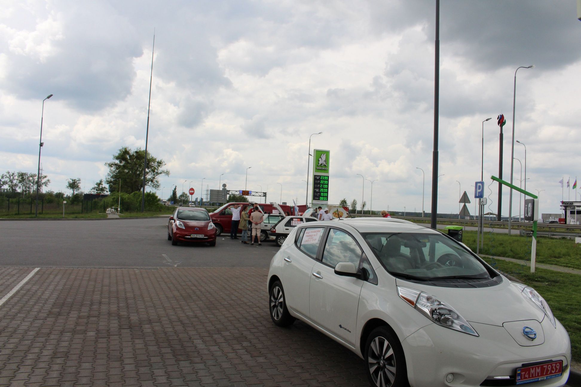 15-30 Приехали в Левков. Четыре Сакса стали на зарядку. Ещё один Лиф подключился к розетке на самом здании заправки ОККО. Для Фольксфагена Комби мощности не хватило. Он поедет следующий участок на дизеле. Остальные Лифы поехали на Киев. Возможно они чуть-чуть подзарядятся в Калиновке.