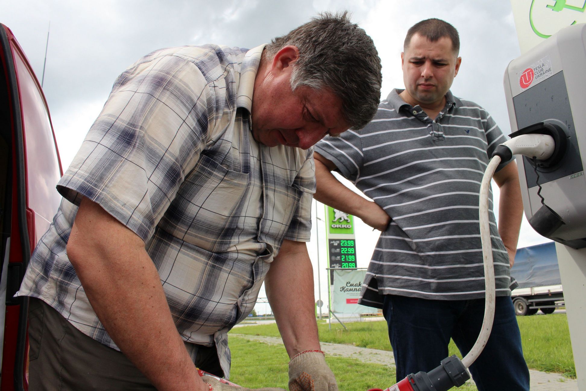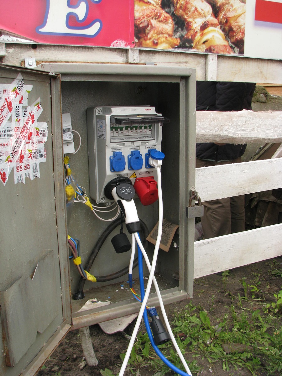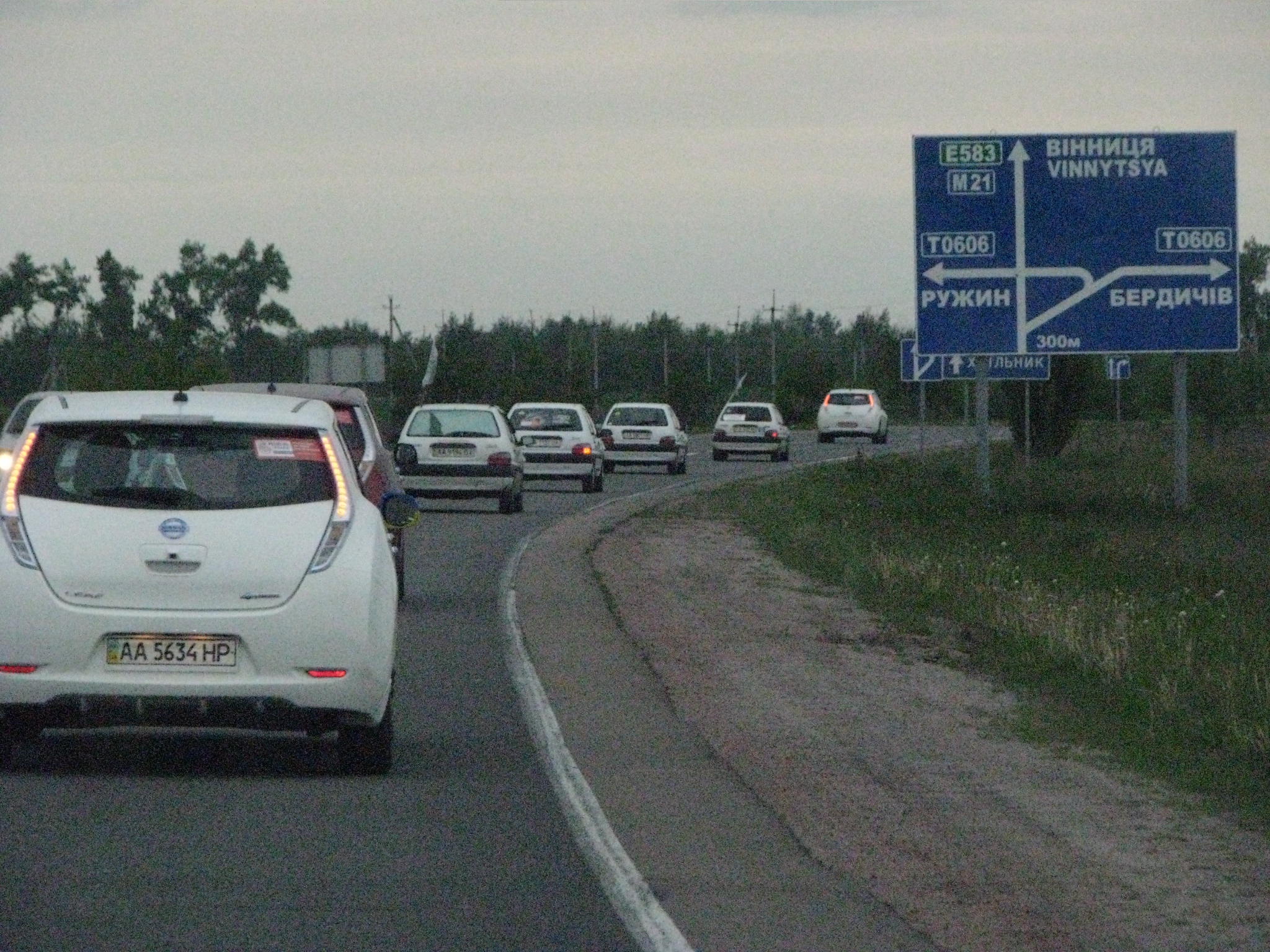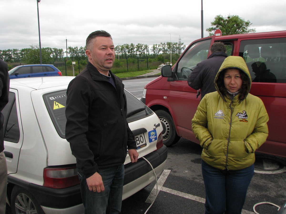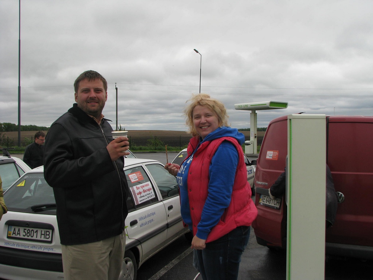 15-30 Приехали в Левков. Четыре Сакса стали на зарядку. Ещё один Лиф подключился к розетке на самом здании заправки ОККО. Для Фольксфагена Комби мощности не хватило. Он поедет следующий участок на дизеле. Остальные Лифы поехали на Киев. Возможно они чуть-чуть подзарядятся в Калиновке.