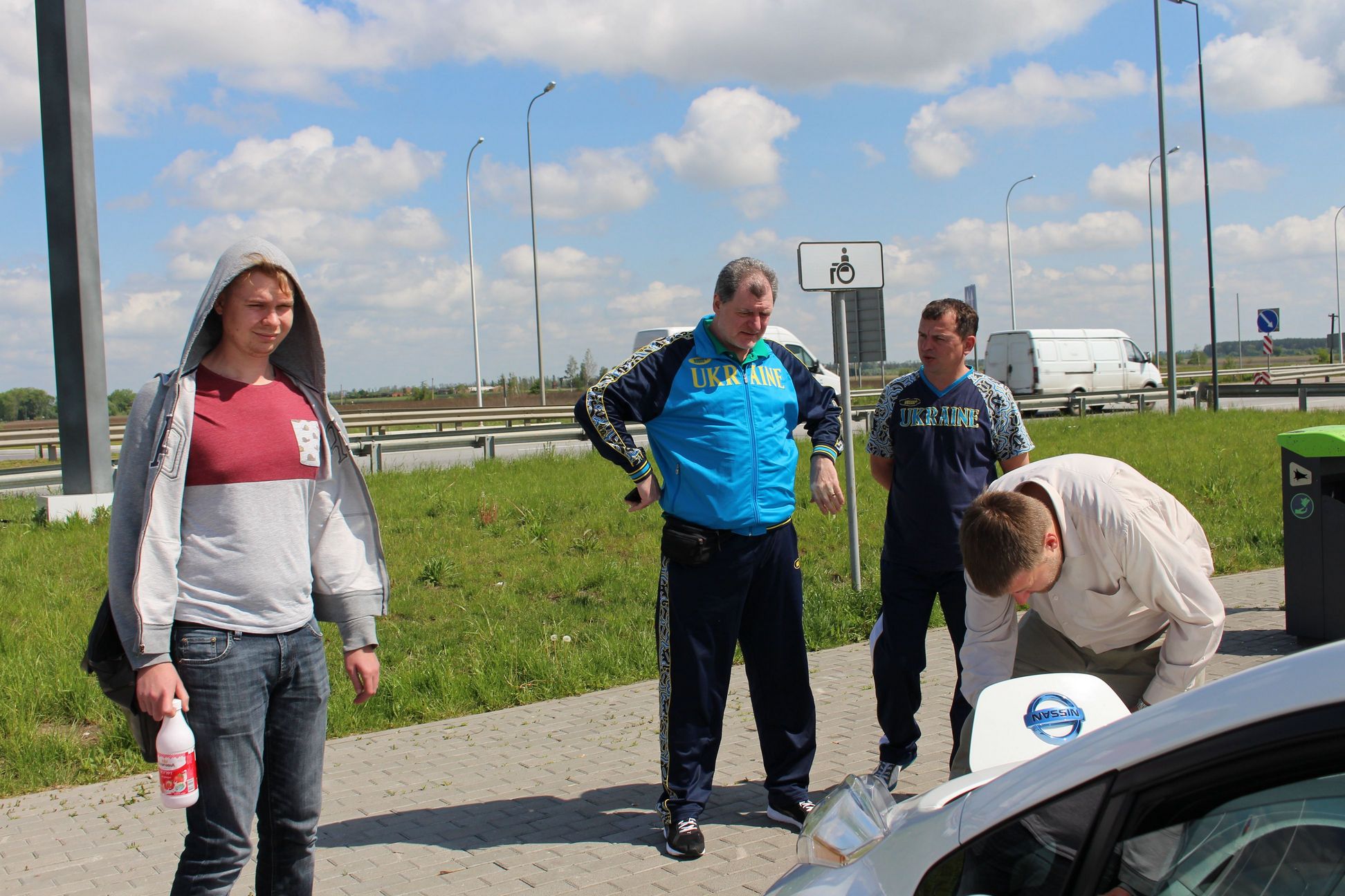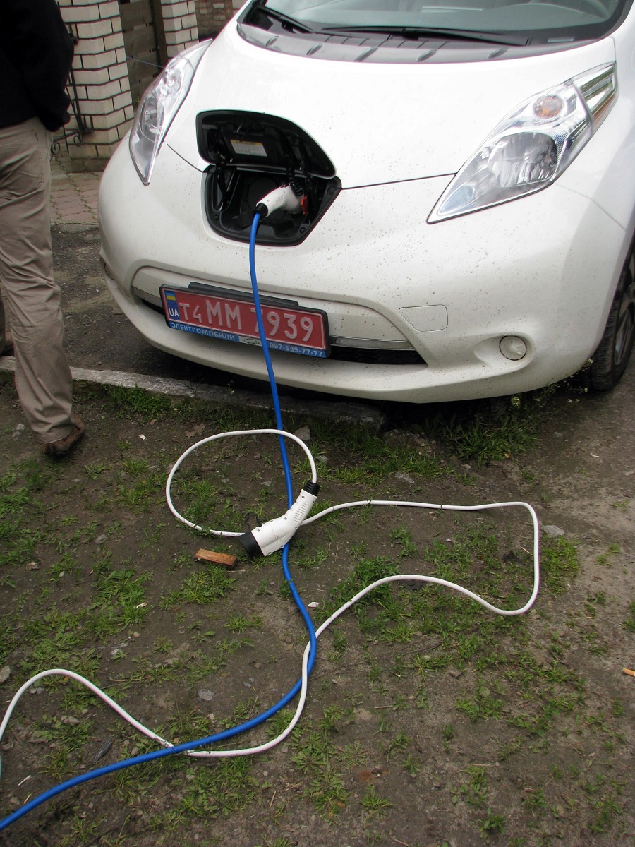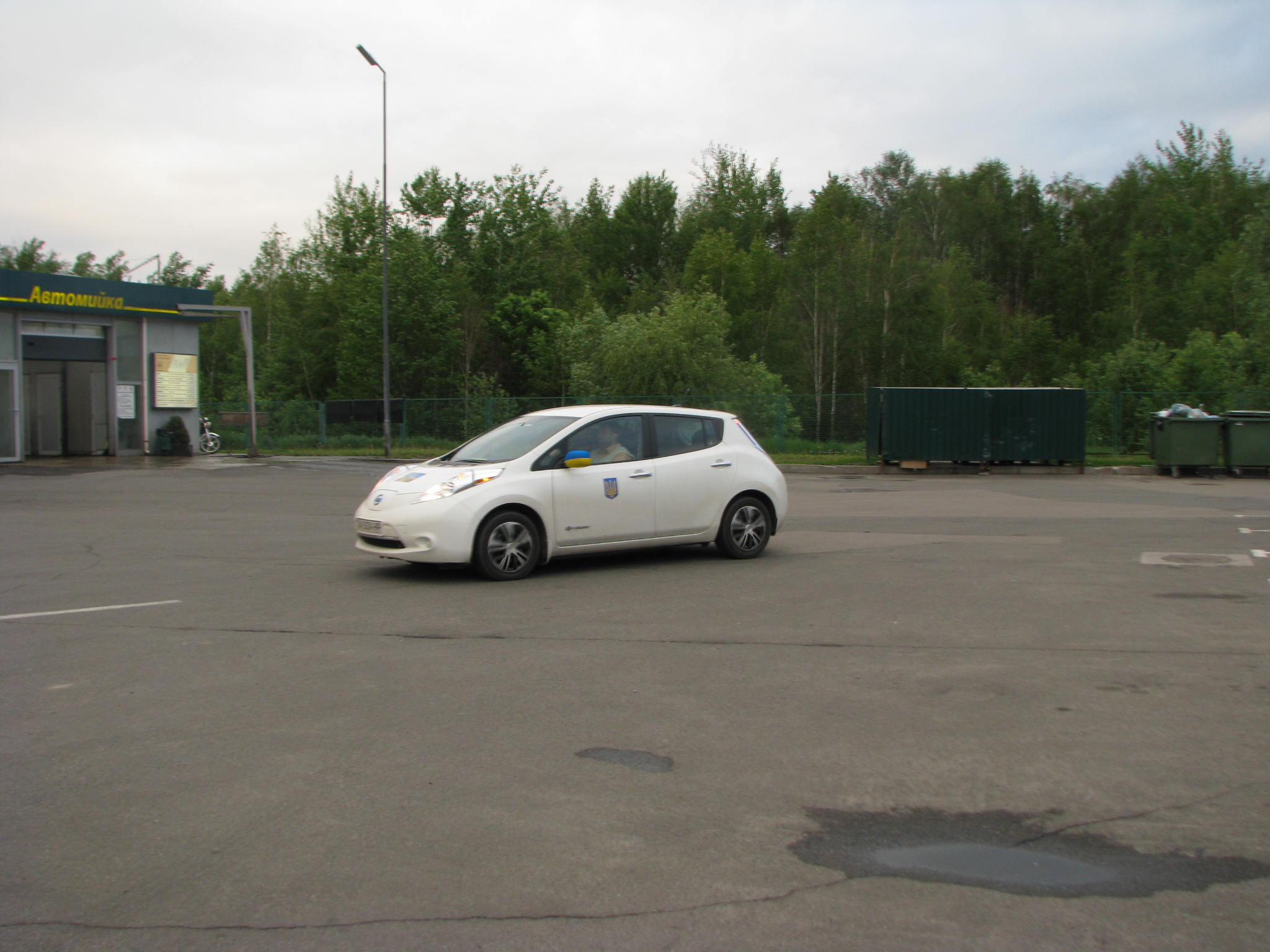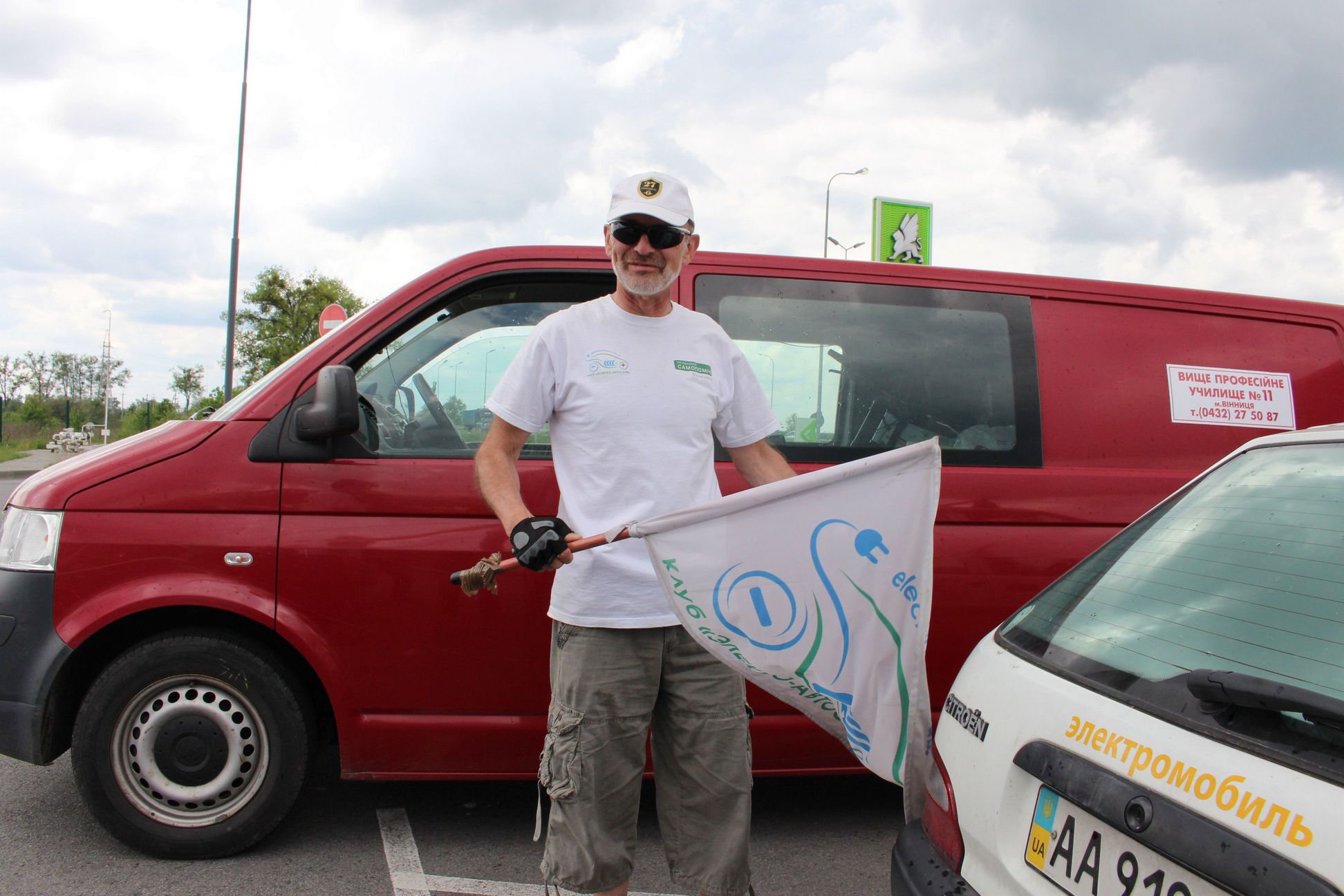 15-30 Приехали в Левков. Четыре Сакса стали на зарядку. Ещё один Лиф подключился к розетке на самом здании заправки ОККО. Для Фольксфагена Комби мощности не хватило. Он поедет следующий участок на дизеле. Остальные Лифы поехали на Киев. Возможно они чуть-чуть подзарядятся в Калиновке.