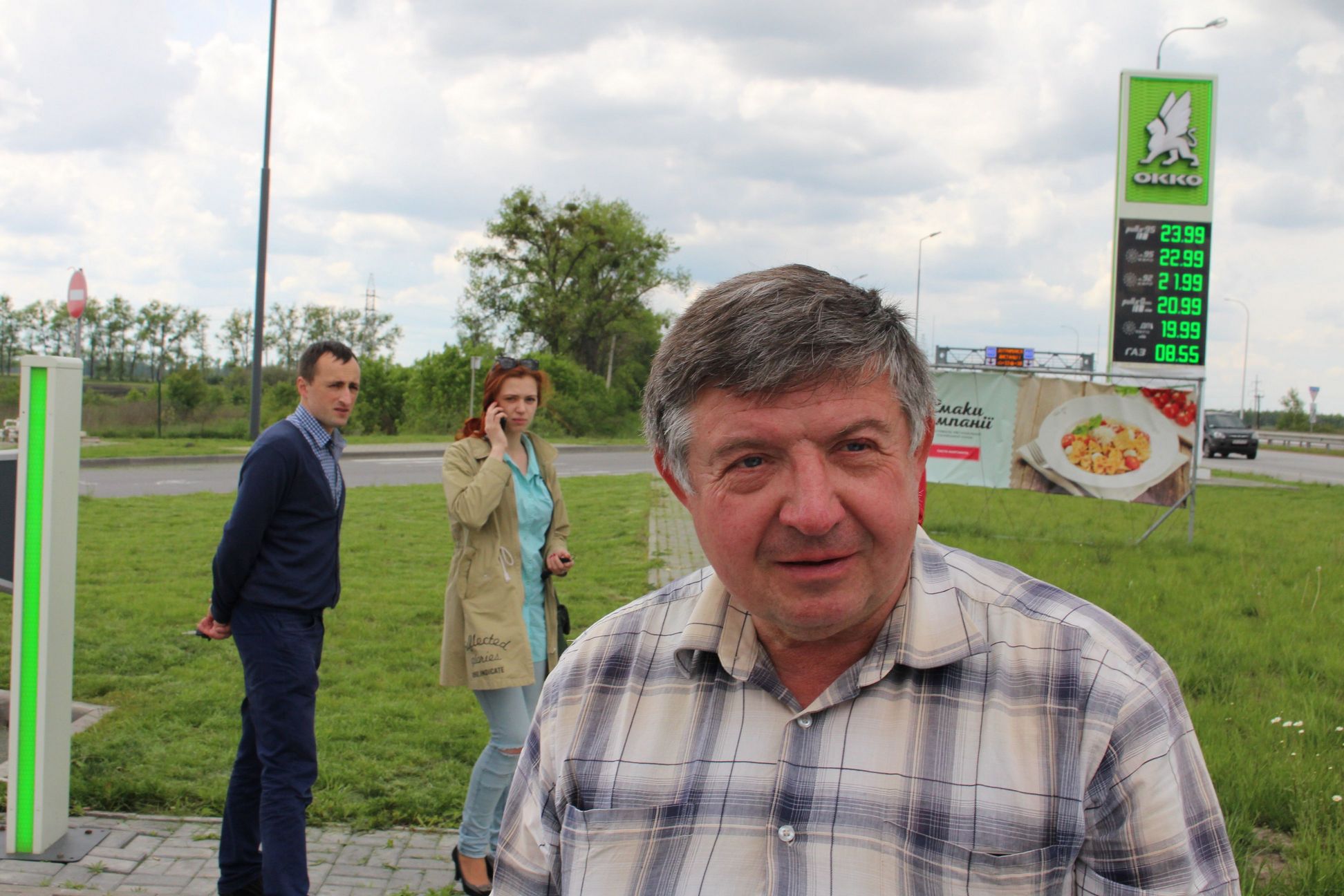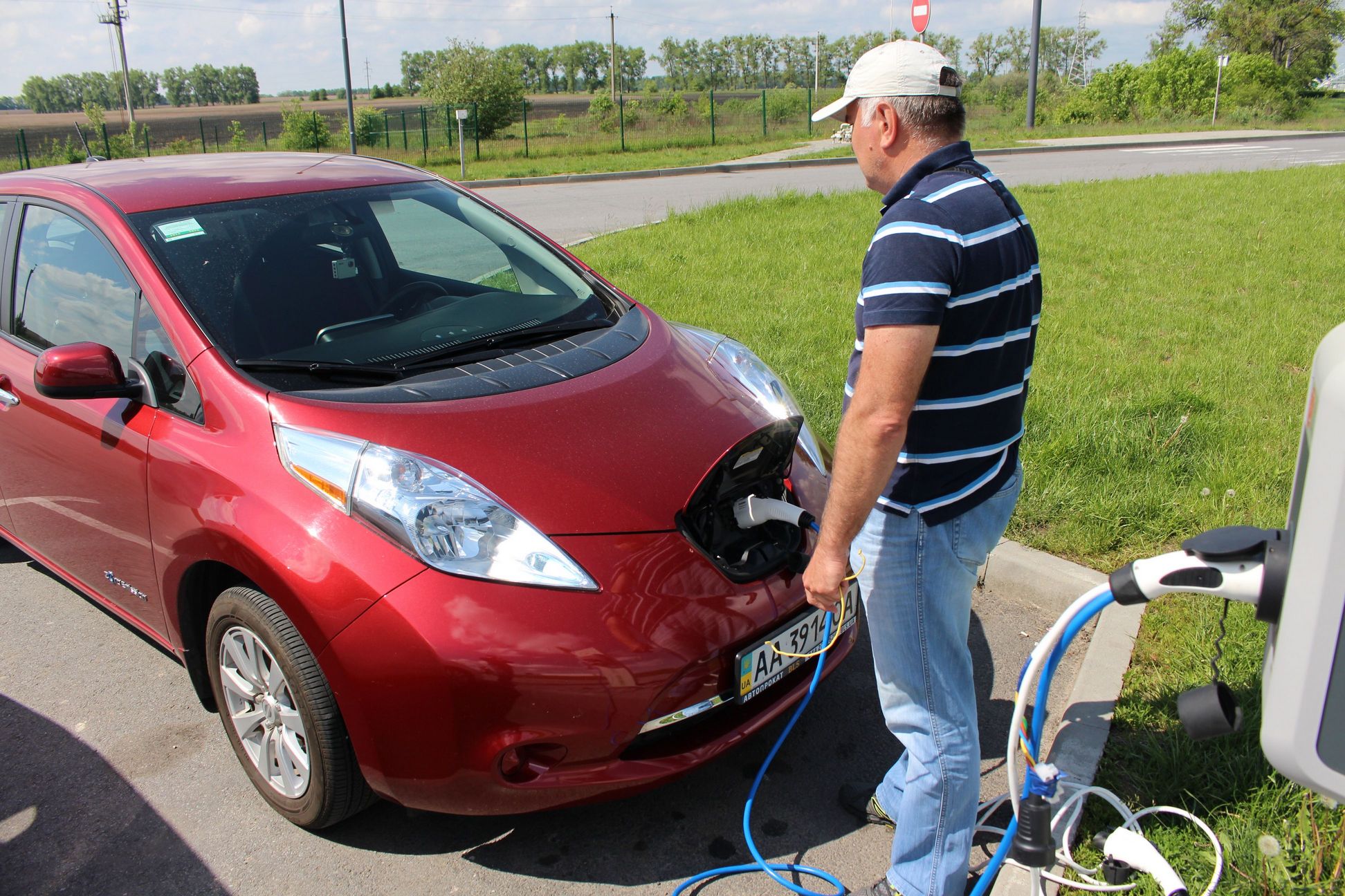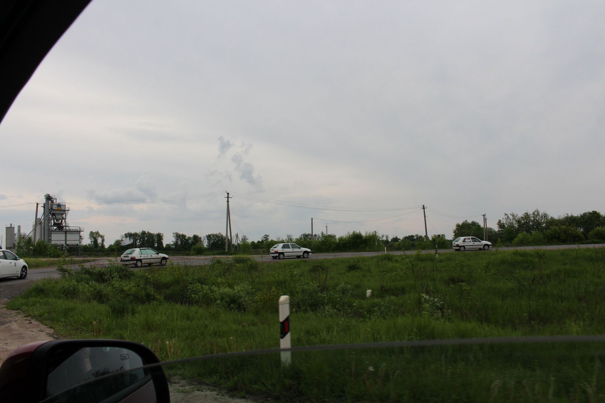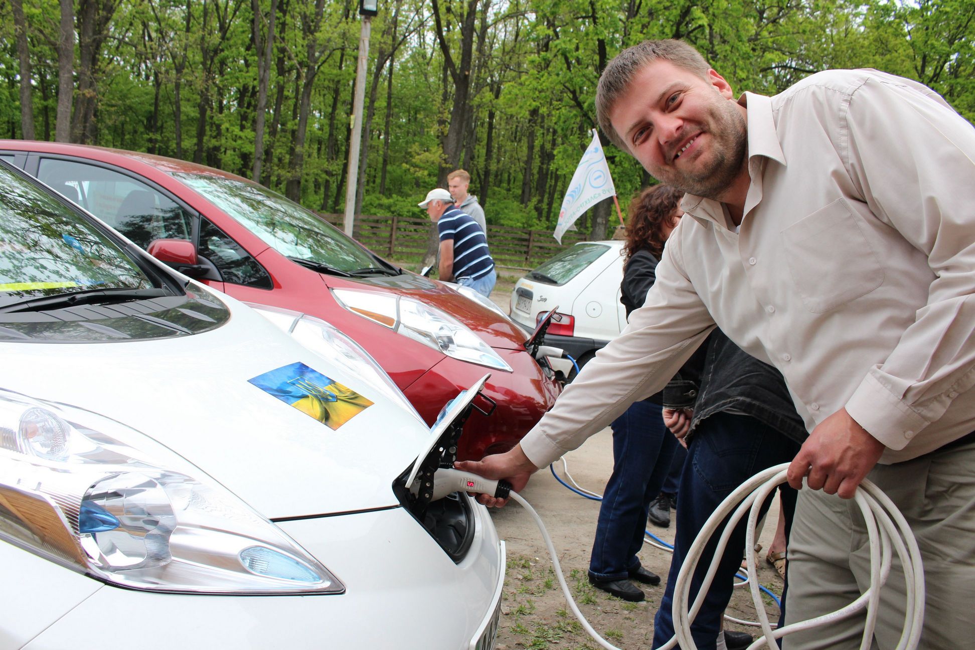 15-30 Приехали в Левков. Четыре Сакса стали на зарядку. Ещё один Лиф подключился к розетке на самом здании заправки ОККО. Для Фольксфагена Комби мощности не хватило. Он поедет следующий участок на дизеле. Остальные Лифы поехали на Киев. Возможно они чуть-чуть подзарядятся в Калиновке.