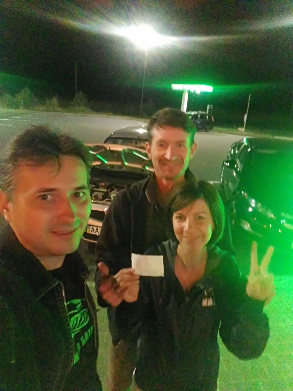 Возвращаясь обратно мы переговаривались в чате с Вячеславом из Винницы, который опять заряжался под Житомиром, но нас никак-бы не дождался. В час ночи мы приехали на зарядку под Житомир, и под крышечкой Кебы неожиданно нашли приветственную записку от Вячеслава. Она реально подняла нам настроение. Думаю, что это отличный способ передачи посланий. Обычный народ на заправках реально боится заглядывать под эти крышечки