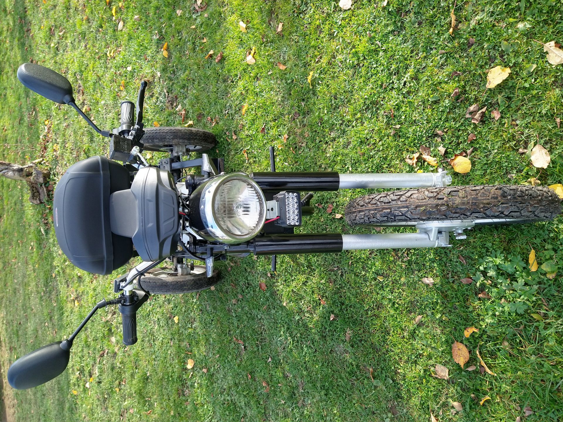 На половину зарядженому акумуляторі максималка по GPS спідометру, склала - 35 км/год. На підйомах по пагорбах, травах, дуже виручала понижена передача, але оскільки гума дорожня, то і буксував місцями. Гуму треба змінити з іншим протектором. Щодо керованості, відпрацювання амортизаторі, передніх-задніх, все чудово. Каталися по одинці і з пазажиром, все чудово. В порівнянні з вантажним трайком і цим, різниця - колосальна. Клієнт задоволений! Залишилося доробити проводку, задній багажник, установити всю світлотехніку, зараз тільки передня фара працює. Установити крила, підключити передні гальма, обшити по бокам і все. В майбутньому можливо заміниться гідравлічний шланг і трос пониженої, оскільки вони надто довгі, довелося це все зкручувати.
