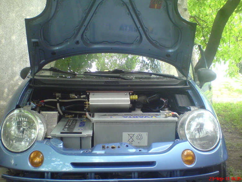 На электромобиле установлен электрический двигатель постоянного тока мощностью 8 КВт развиваемой при максимальной частоте вращения 2000 об/мин. Двигатель запитывается от блока стартерных кислотных аккумуляторных батарей с номинальным напряжением 82В, подзарядку которых частично обеспечивает бензогенератор мощностью 3500Вт. Остальные конструктивные элементы автомобиля оставлены без изменения. Управление оборотами электродвигателя производится импульсным регулятором напряжения. Возможность регулировки оборотов с дискретностью в 1% обеспечивает плавность и динамичность автомобиля. Управление импульсным регулятором напряжения производится при помощи педали акселератора через блок контактов. Зарядка АКБ производится от сети 220В или от бензогенератора. Выбор режима зарядки производится из кабины. На панели приборов электромобиля выведены все необходимые измерительные устройства, обеспечивающие полный контроль за состояниями силовой установки и аккумуляторных батарей. Максимальная скорость, развиваемая электромобилем, составляет 60 км/ч. Запас хода на одной подзарядке составляет до 50км., а при включенном бензогенераторе – от 100 до 150 км. Разработанный электромобиль является весьма экономичным и экологически безвредным. Расчеты, произведённые в экономической части проекта, показали, что окупаемость затрат на переоборудование автомобиля окупается после 49413 км пробега, что при среднегодовом пробеге 20000 км произойдет на третьем году эксплуатации. Стоимость пробега 1 км снижается в результате переоборудования в 13,7 раза.