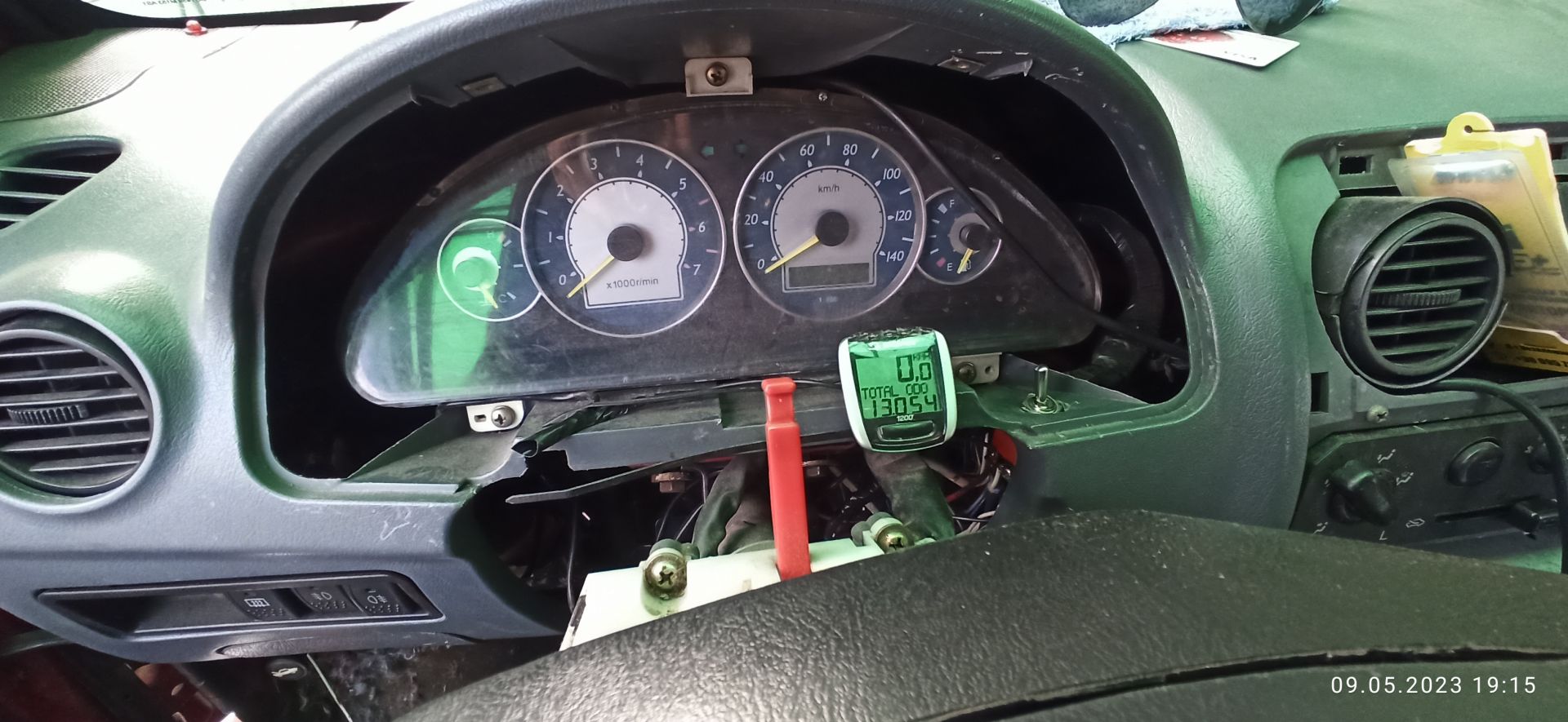 Від першого дня переобладнання, і так вийшло що від початку повномасштабної війни, мій автомобіль практично кожен день їздив. Перший місяць я користувався двома зарядками, однією заряжав батарею 48в а іншою 12в. На той момент була маленька збірка 14s на 60аг з єфективно віддачею 2.7квт год. І не дивлячись на це а за день намотував 20-60км. Приборка, звичайно не працювала. Швидкість і кілометраж заміряв жпс спидометром. Майже через два місяці набридло користуватися телефоном замість спідометра і вирішив тимчасово поставити велоспідометр.