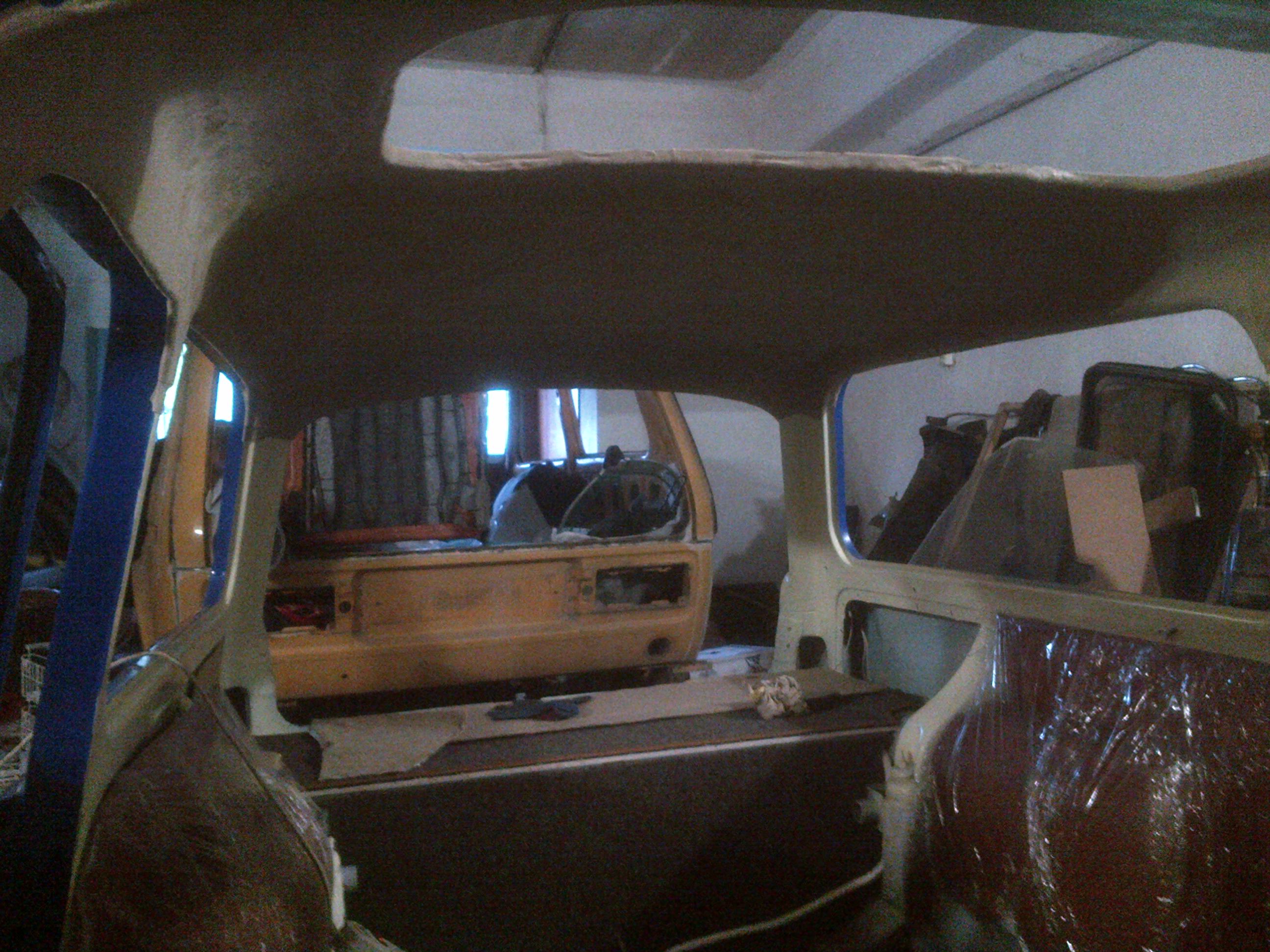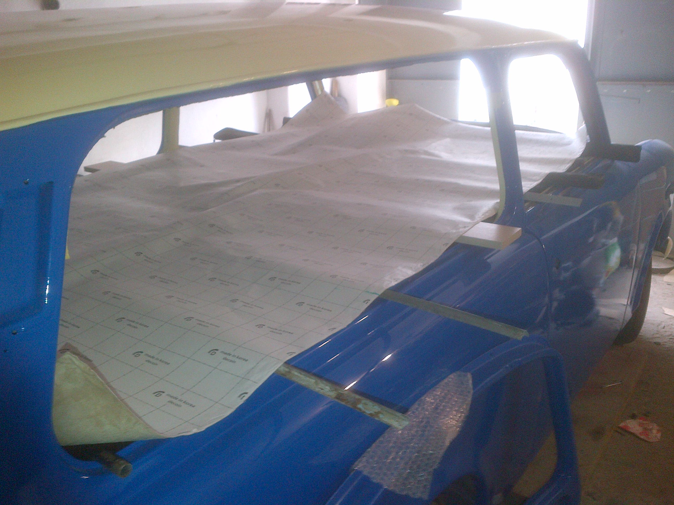 Трудность была в том, чтобы получить равномерный переход между поверхностью крыши и передней кромкой профилированного каркаса кузова. (крыша крепится к дальней кромке). Для этого было принято использовать армированный водостойкий скотч, выклейка которого позволила получить поверхность с плавным переходом. Далее на крышу и полученную поверхность был наклеен пенополистерол 5мм (самоклейка). И вот на полученную поверхность надо было наклеить т.н. "Корейскую самоклеищуюся алькантару".