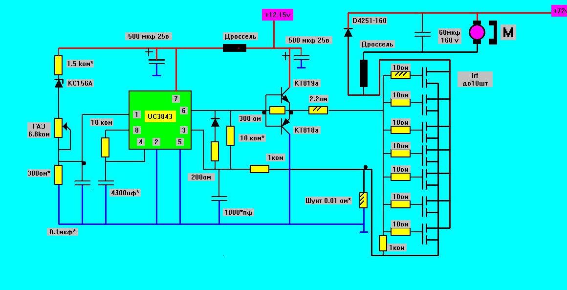 Не ну можно и как на физике в 8 классе просто огромный реостат, и обогрев салона и регулятор. Но шим однозначно лучше, особенно если мощность мотора пересечет отметку в 3квт. Если в средней схемме пересчитать делитель оптопары, заменить ключи раскачки на драйвер и добавить стабилизатор питания драйвера и микросхеммы то можно получить полноценный контроллер с регулировкой тока. Как то так. Но схемму надо еще проверять и исправлять ошибки на практике. Дорисовывать цепь запирания ключей в случае обрыва провода педали газа и тд. Короче. Если автор темы захочет то дорисует и исправит ее под себя