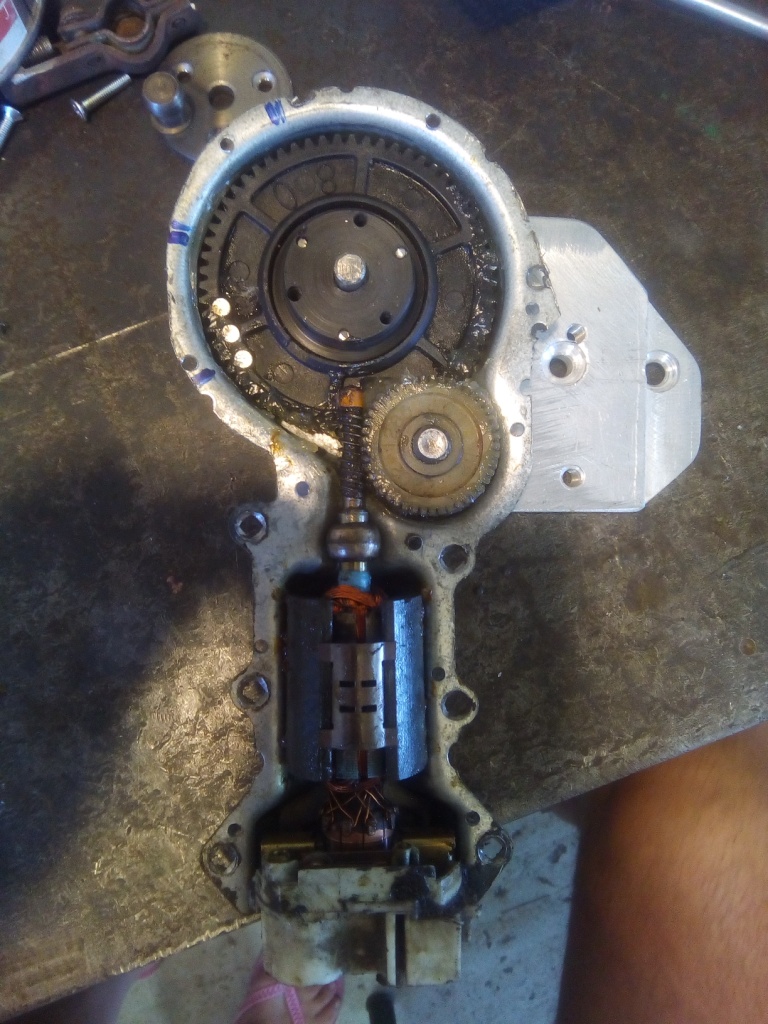 сам моторчик взял от стеклоподъемника ,редуктор двухступенчатый,червяк плюс еще цилиндрическая шестерня.,корпус металлический,в общем взрослый мотор с понтиака....