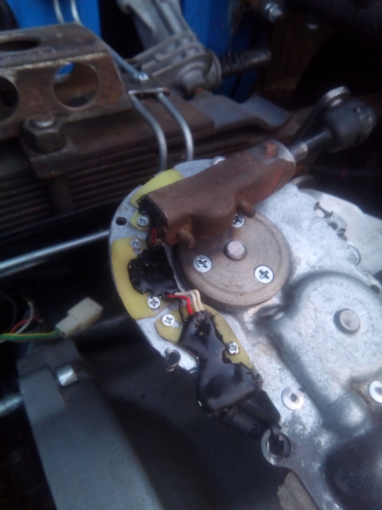 Коментарій до файлу: ну и вот собственно привод в сборе,видно три отверстия для датчиков .датчики на платках,и можно если что подрегулировать положение,по тому как нельзя чтобы кулиса была в напряге в крайних положениях,а то она будет тереться об муфту синхронизатора