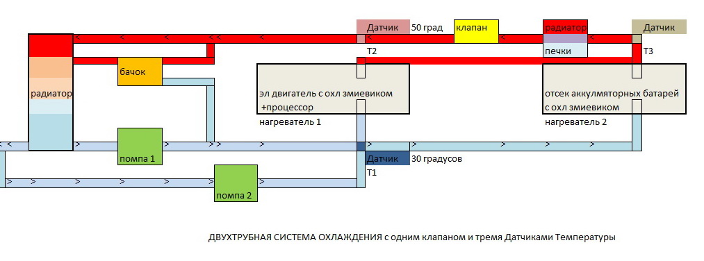 Я привел схему управляемой системы охлаждения, именно для полноценного электромобиля. Указав текущие градиенты в режиме именно максимальной допустимой нагрузки. В постах далее я отметил, что данная схема имеет существенное преимущество, в том, что работает она на принципе управления потоком охлаждения (с контролем температуры) и если в ней поставить доп клапан и нагревательный элемент подогрева, он понты стоит его можно сделать самому.