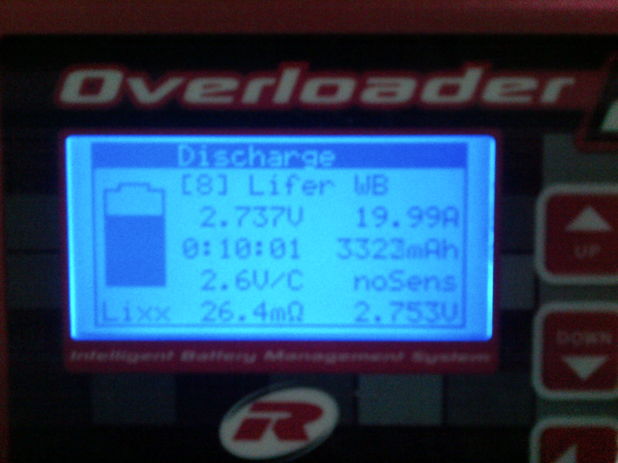Разряд проводил дома, при комнатной температуре, нагрузкой 20А, т.е. 0,5С. Зарядка контролирует разряд автоматически и останавливает его при снижении напряжения под нагрузкой до 2,6В. После снятия нагрузки в конце разряда, напряжение на ячейке оставалось 3,12В что соответствует 80% разряду при нормальной температуре согласно спецификации производителя.