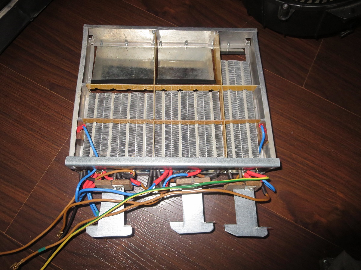 Осенью таки разобрал торпедо и добрался до печки. Вынул теплообменники печки и кондея. Вместо теплообменника кондиционера сделал и поставил конструкцию с тремя керамическими нагревателями. Два по 1,5 кВт и один 1,2 кВт. На 1,2 квт завел 220В. 1,5 - две штуки подключил на батарею, получив двухступенчатую регулировку мощности. Слабовато конечно греет на моих 150В макс, но думаю это разумный баланс между мощностью и энергопотреблением. Так же установил автономку 2,2 кВт как основной источник тепла.