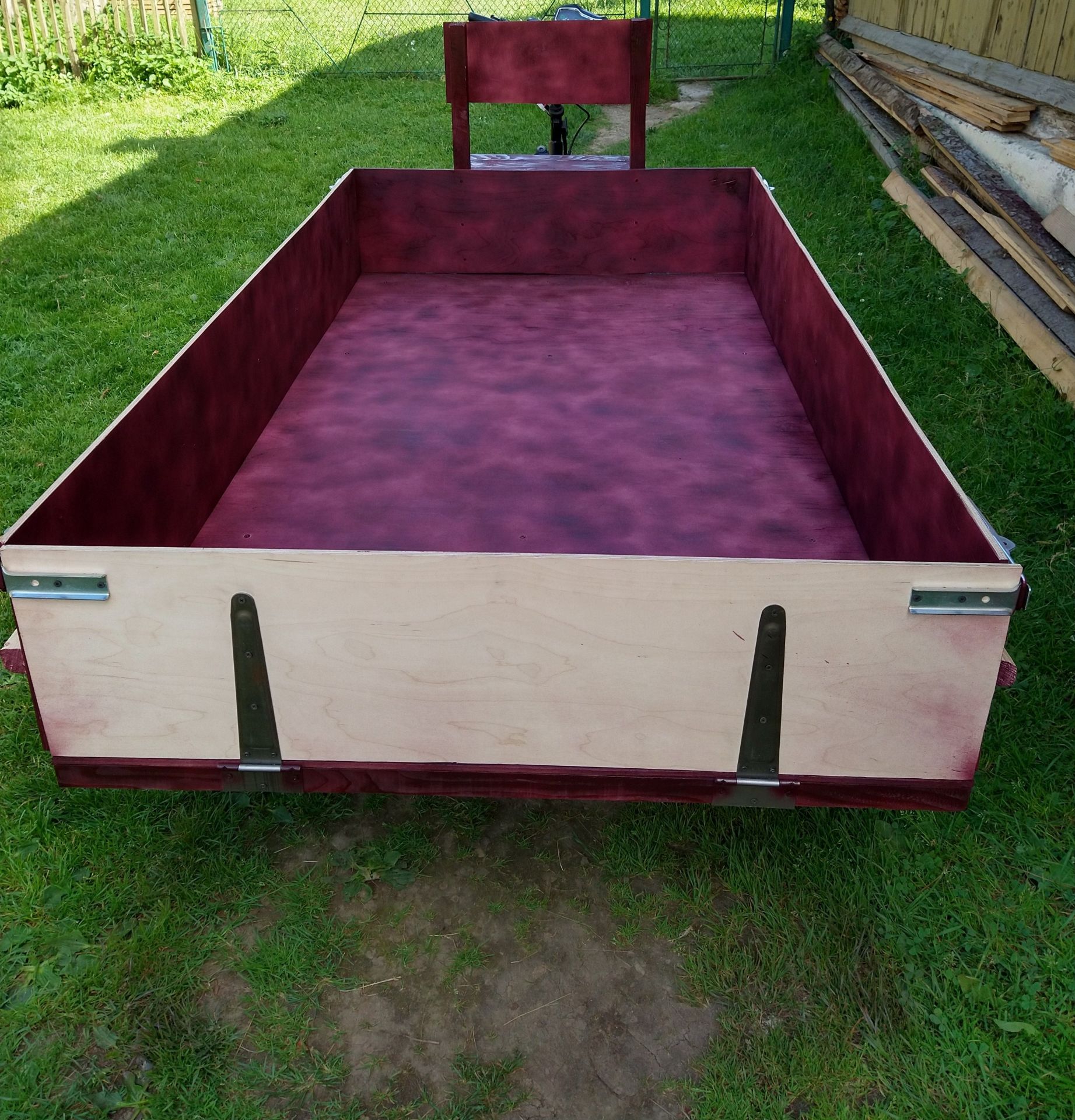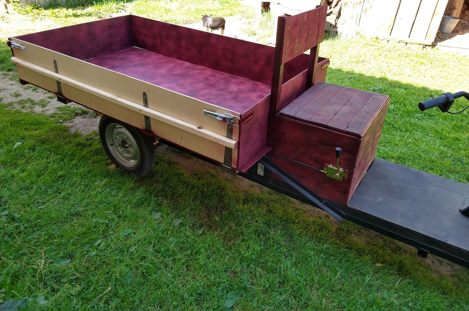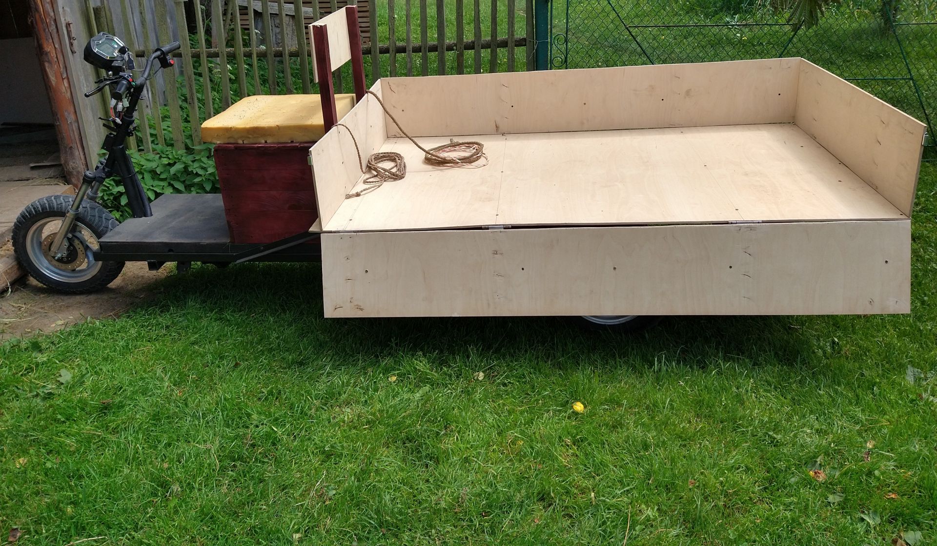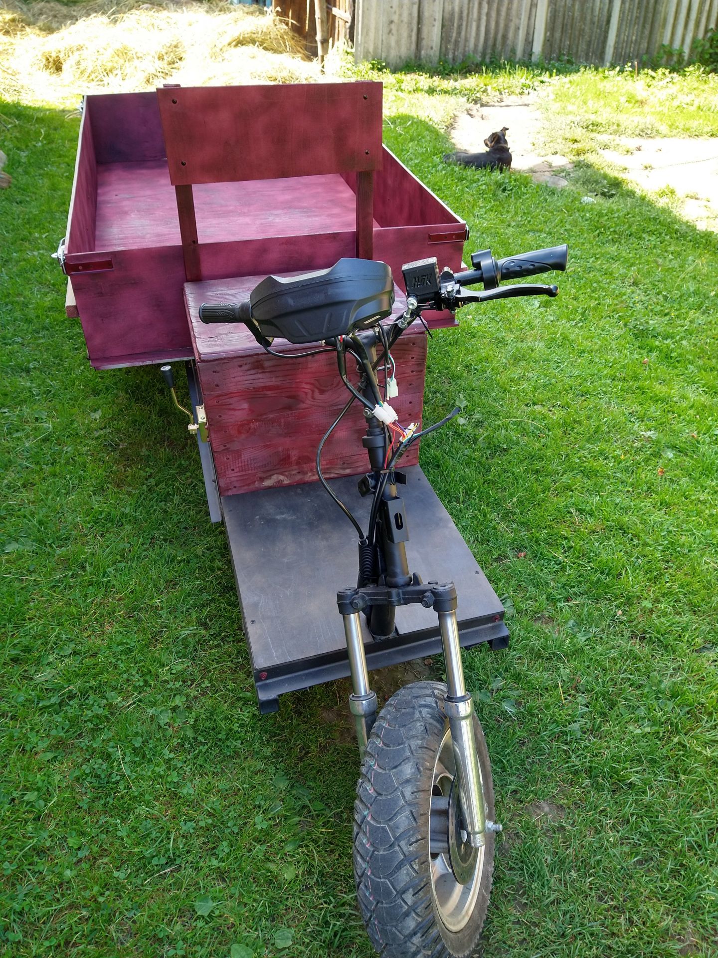 Після того, як в далекому 2016 році, було власноруч зроблено електромопед альфа, який і по сьогоднішній день радує. В голові засіла думка, зробити електричний трайк, який би виручав по господарству. Привезти мішки з картоплею, сіно і т.д. Весною на аліекспрес, замовив комплект: електричний міст - 80 см, 60В/1200Вт, контролер 48-60В, 55А, гідравлічна система двохпоршньова, тросік для вкл/викл пониженої... Хотів купити в Україні у вольти, але на той момент в наявності не було та і гальма хотілося не барабанні, а гідравлічні. Спочатку планував використати в якості донора раму від восхода 2, зробити короткий трайк з причепом. Але гідролінія, виявилася аж 2,5м, (продавець під час спілкування сказав, що гідролінія -1,5м). Тому вирішив, зробити довгий трайк з бортами. На олх, купив раму від скутера Фада 150 кубів, що послужила донором до якої приварена основна рама. Рама із профільної труби 40х40х3. Кузов із водостійкої фанери 9мм. Задня підвіска відсутня. Фазні провода з двигуна - 6мм кв. Якщо вірити опису на даний двигун, то крутний момент при 60 вольтах - 287 N.M. Випробування показали, як і було задумано на початку, що з такою шириною моста, трайк має бути коротким! Тому дана версія трайка - буде вкороченою, або все ж таки, даний міст перейде на восход 2.
