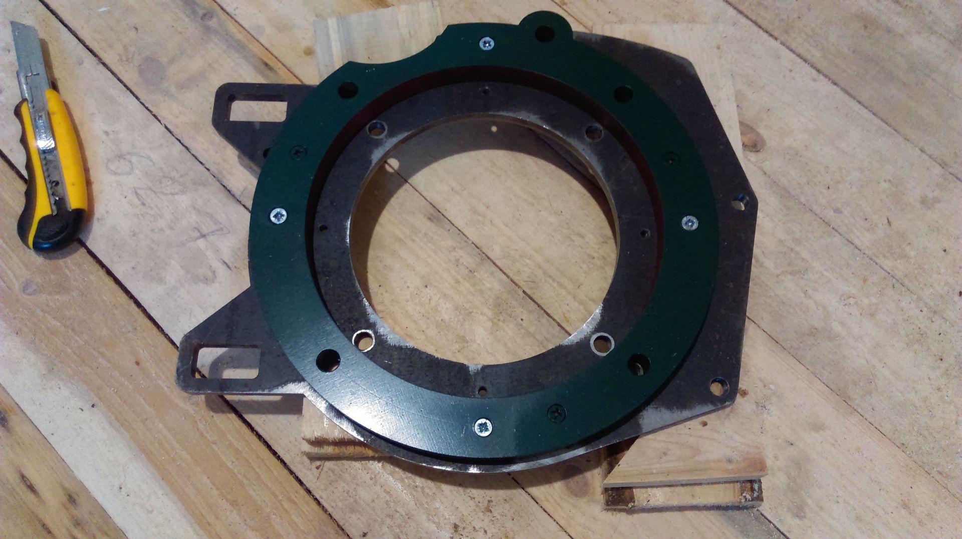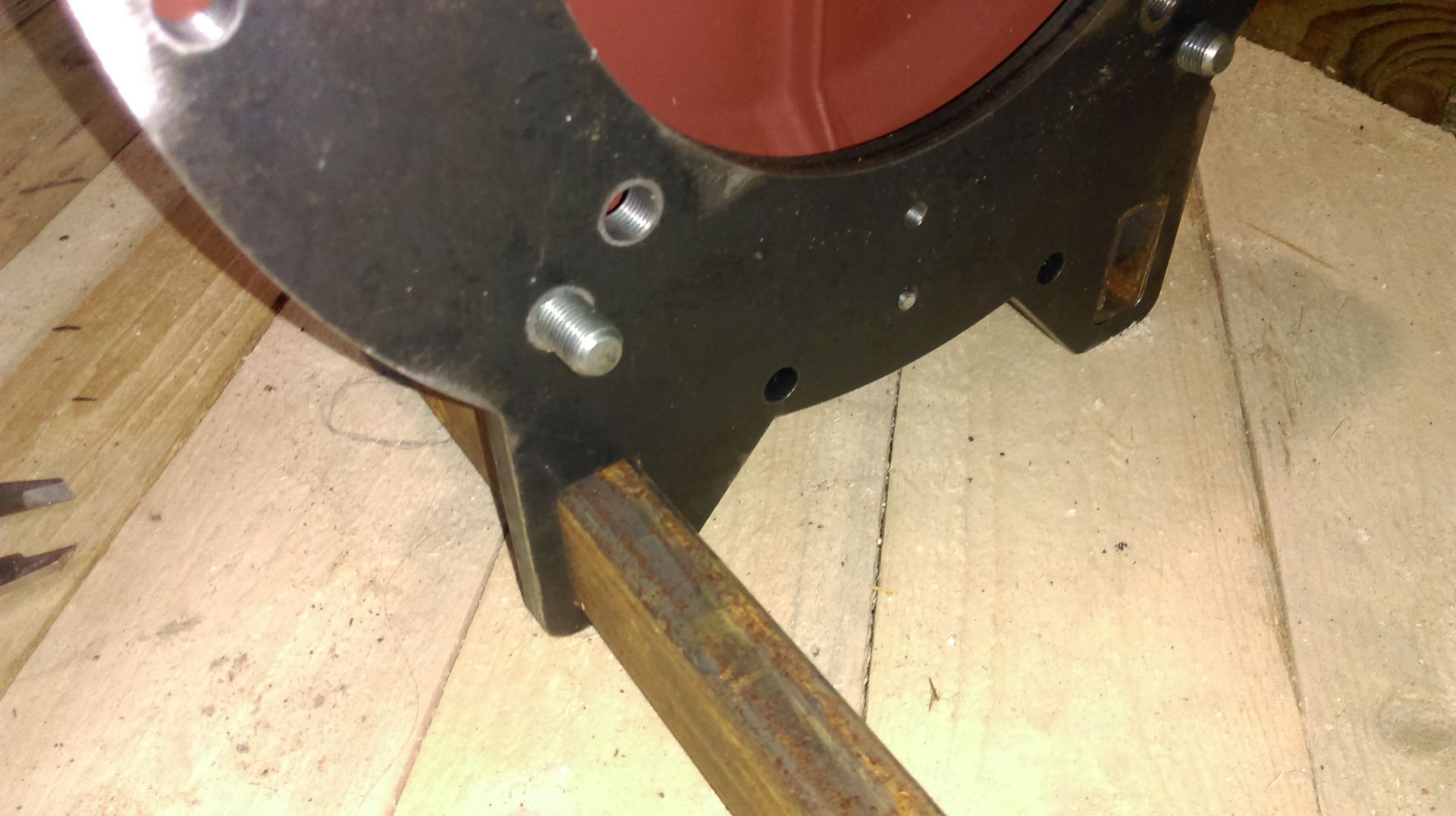 подготовить два отверстия,в них выточить вставки,по принципу чтобы они запрессовались в плиту и кольцо,и прослабить там где они заходят во фланец мотора,в них должна быть либо внутренняя резьба(мне больше нравится) если диаметр позволяет,либо наружная,если внутренняя то хватит 12,если наружная то 14 и больше.