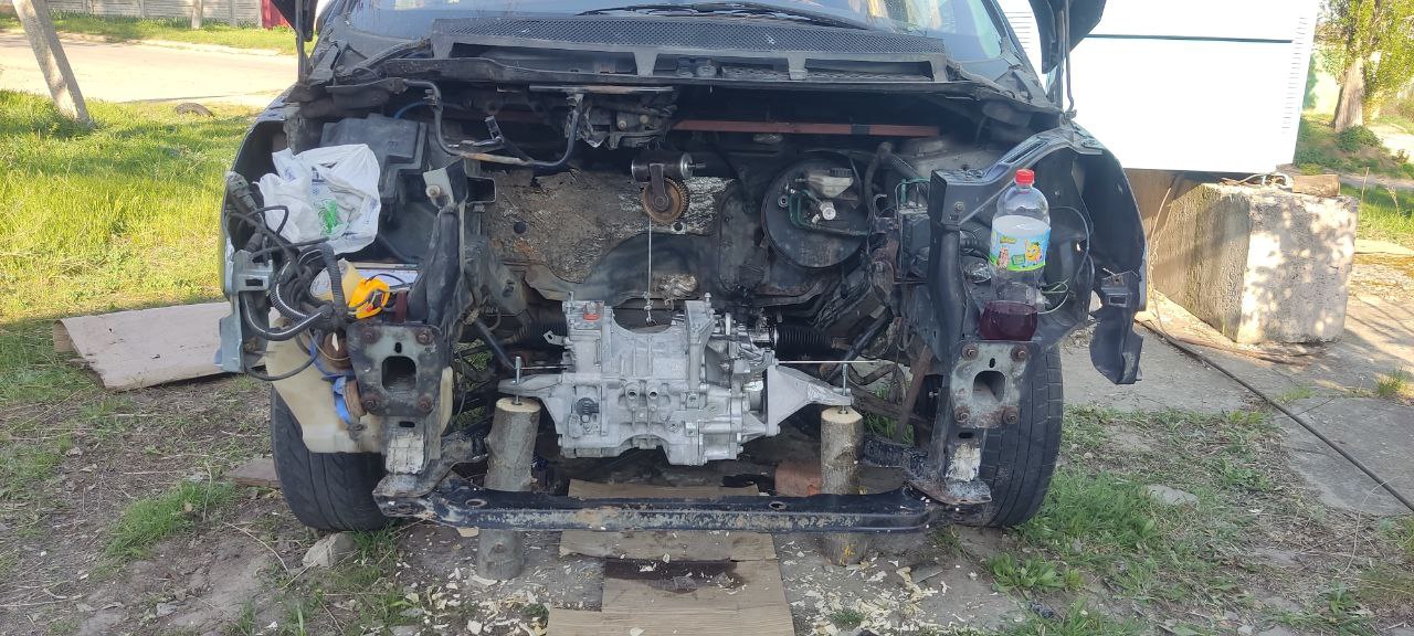 Донор був придбаний уже без двигуна. Стан — не ідеальний, але й ціна була приємною. На даний момент з-під капота демонтовано все, що може заважати, і вже почалося примірювання електродвигуна.