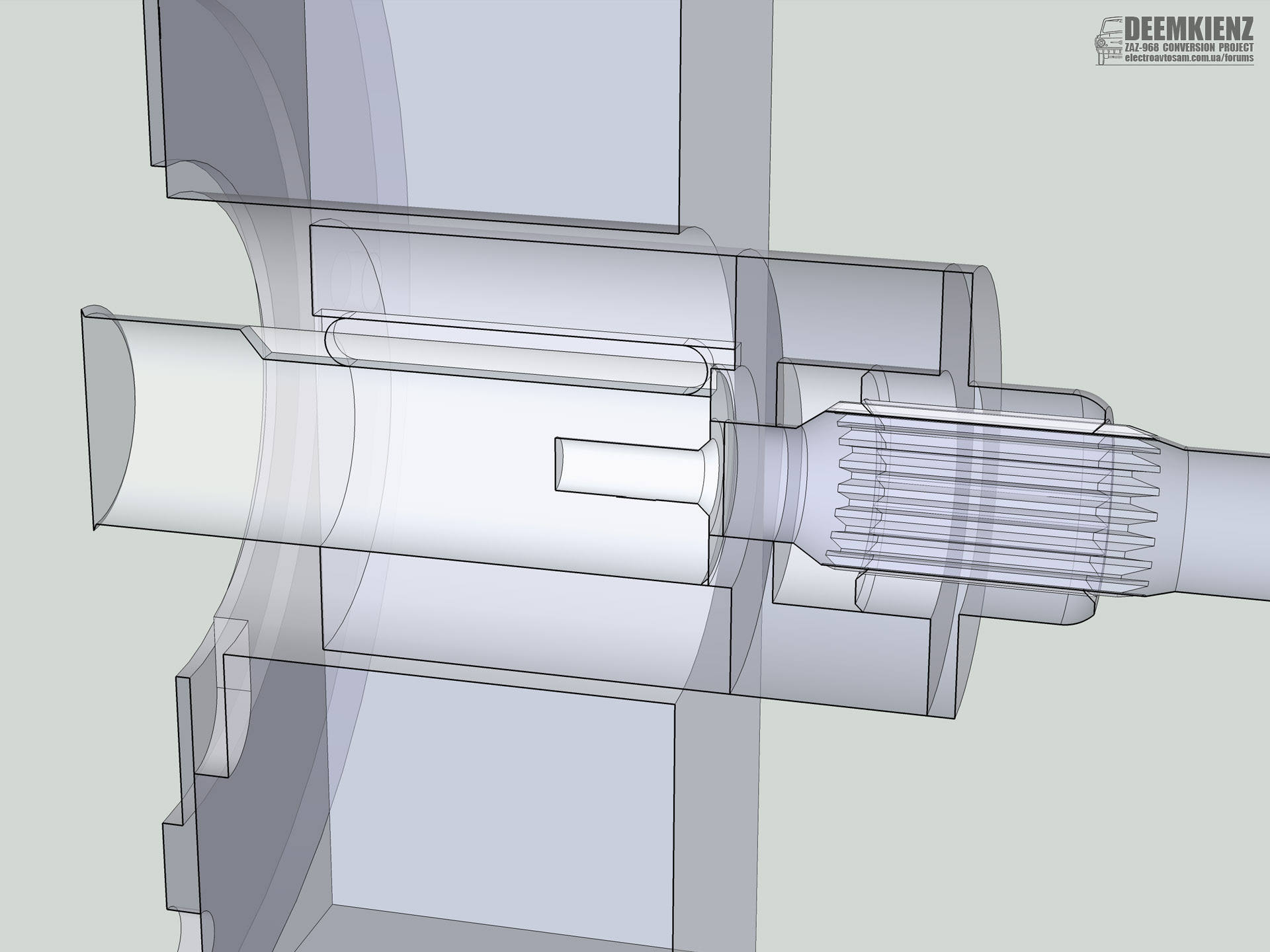 Процесс потихоньку идет, очень медленно, т.к. кузовными работами до этого никогда не занимался. Но, получается довольно неплохо, и вообще, интересно осваивать что-то новенькое - исправил множество проблемных мест. Ещё параллельно отчистил, и аккуратно разобрал в дребезги коробку передач . Тем временем продумываю узел присоединения мотора, делаю 3D-модель. Уже определились некоторые моменты. Исходя из того, что вал двигателя прилично выступает, переходная плита должна быть очень толстой. Думаю, есть смысл сделать её из части картера старой сороковки. Самый большой плюс - легкость центровки за счет заводских проточек, а значит, останется соосность первичного вала КПП и расточки под вкладыш коренной шейки коленвала. А уже для центровки промежуточной пластины с мотором относительно картера, можно использовать родной укороченный вкладыш или новую деталь подобной формы. Больше всего мне нравится соединение валов на жесткой муфте, без резинок. Шлицевую от диска сцепления думаю прикручивать болтами, без сварки (на модели пока болты не прорисовал). По коробке - надо будет только укоротить "перчик" первичного вала, чтобы от него осталось 7-9мм. На данный момент пытаюсь сообразить относительно таких нюансов: 1. будет ли достаточно 4-5мм толщины стальной промежуточной пластины между картером и мотором для нормальной прочности; 2. какой нужен минимальный зазор между торцами вала мотора и первичного вала; 3. годиться ли центрировать в муфте часть от диска сцепления по её наружному диаметру - похоже, там есть след от точения. Коллеги, буду благодарен за любой совет, самому рассчитывать такие ответственные вещи мне как-то стрёмно .