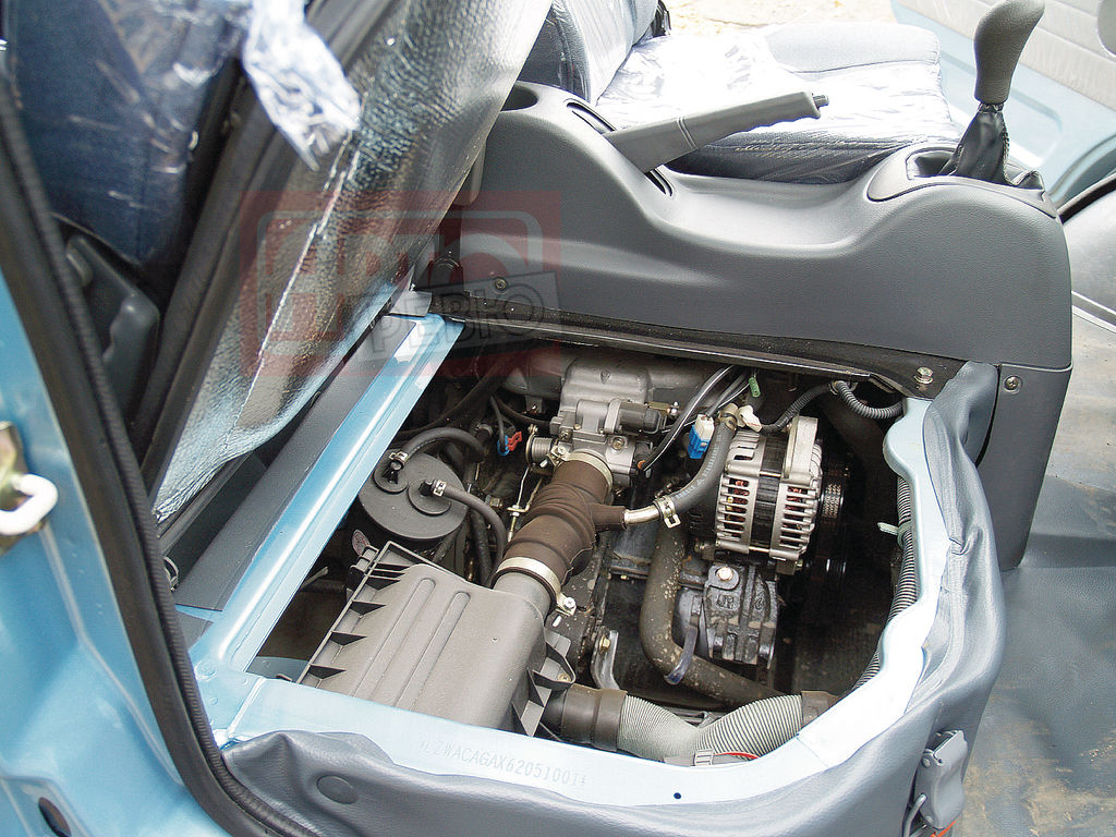 Чтобы протиснуться на третий ряд, нужно поднять правое сиденье второго ряда. Пол в салоне — абсолютно ровный Двигатель расположен под передними сиденьями. Доступ к нему открывают подъемные подушки сидений Под крохотным капотом — лишь те узлы, которые требуют оперативного контроля. Например, расширительные бачки системы охлаждения и тормозной системы, а также резервуар омывателя лобового стекла