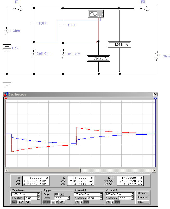 І ми отримаємо - нульове перетікання, адже в кожну мільйонну секунди напруга буде змінюватись і автоматично через кожну гілку внаслідок закону Ома буде змінюватись як струм так і опір ( бо в хімічному елементі опір це похідна струму/температури/хімії) і в будь який момент часу, не залежно від того йде заряд чи йде розряд , кожна гілка буде балансуватись в залежності від напруги своїми власними струмами...