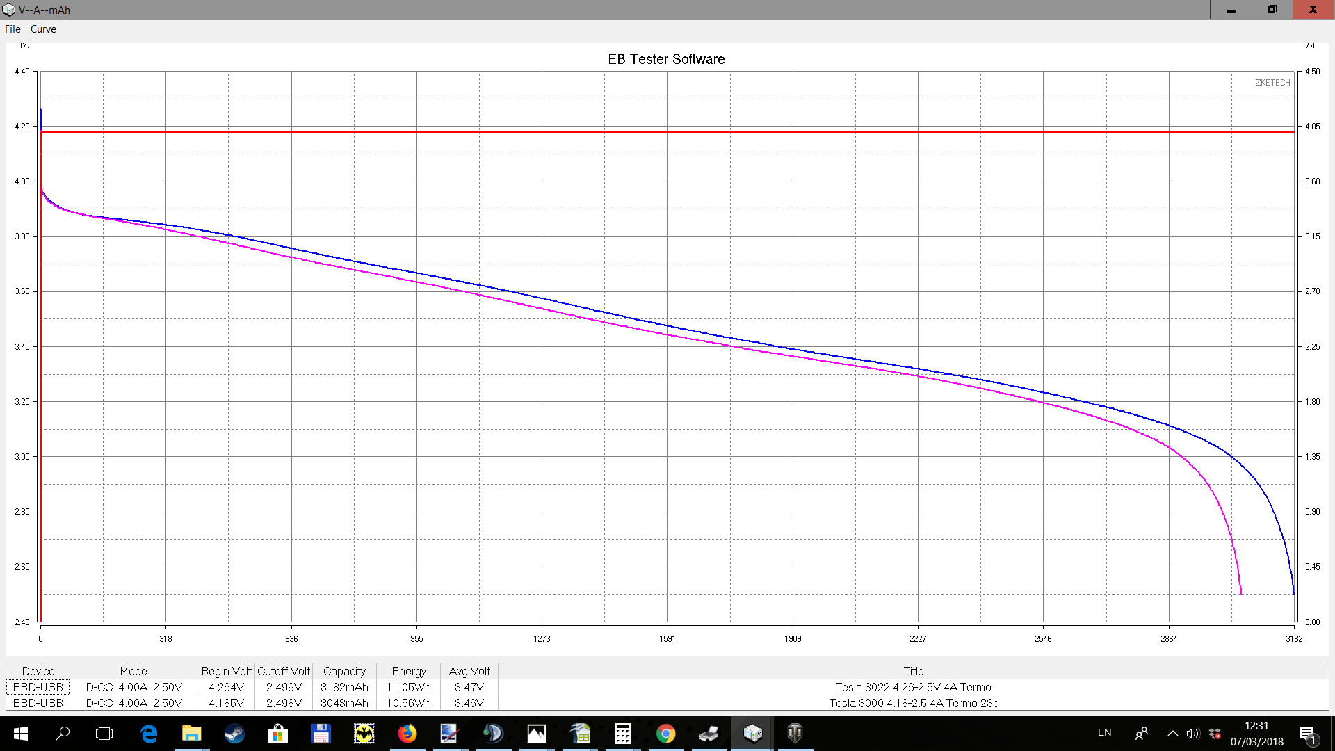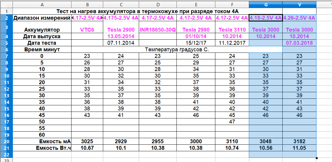 Как и обещал тест разряда элемента который был заряжен до 4,48В и пролежал почти 5 месяцев. Емкость в Ноябре при разряде с 4,48В током 3А была 3198мА. После 5 месяцев в коробке 3182мА током 4А. Греется так же, то есть внутреннее сопротивление не изменилось. Нормальная емкость при 4,18В 3048мА