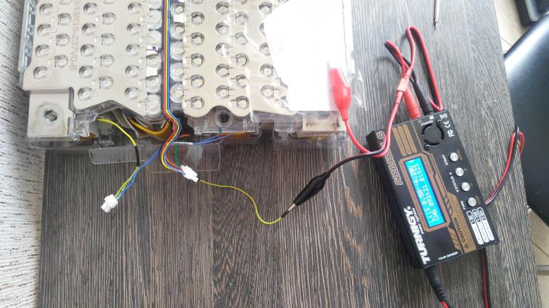 Давно хотел разобрать модуль от автомобиля Tesla. И наконец весной этого года решился. Просмотрев сообщения на OLX нашел модуль от автомобиля 2015года и поехал за ним вооружившись тестером. Выехал и начался сильнейший ливень, который не прекращался до момента пока модуль не был помещен в багажник авто. Приехал, промерял напряжение на 8 модулях и убедился, что на всех оно одинаковое 23,33В. Выбрал 1. Продавец сказал, что BMS мне не пригодится родная и отдал модуль без нее. Я как,то и не придал этому значения. Уже дома пожалел об этом. Созвонился с продавцом попросил отправить BMS. Он согласился, я ему оправил СМС с адресом и до сих пор жду когда он ее отправит). Заветный модуль в руках и весит около 25кг. Ломать его не хочется, а напряжение 25,4 маловато, да и емкость многовато. Оторвал 1 предохранитель на модуле и к элементу подключил модельную зарядку. Померял емкость элемента.