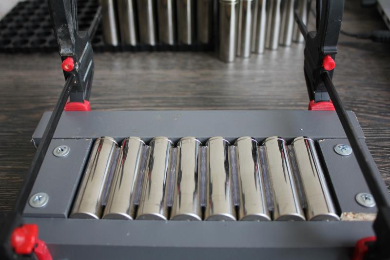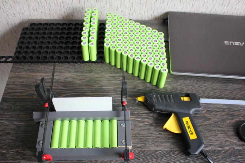 С формой определился. Перед сборкой проверяю напряжение на каждом элементе. Все элементы с одинаковым напряжением 3,888В Собираю шаблон для склейки элементов. Склеиваю элементы термопистолетом с двух сторон.