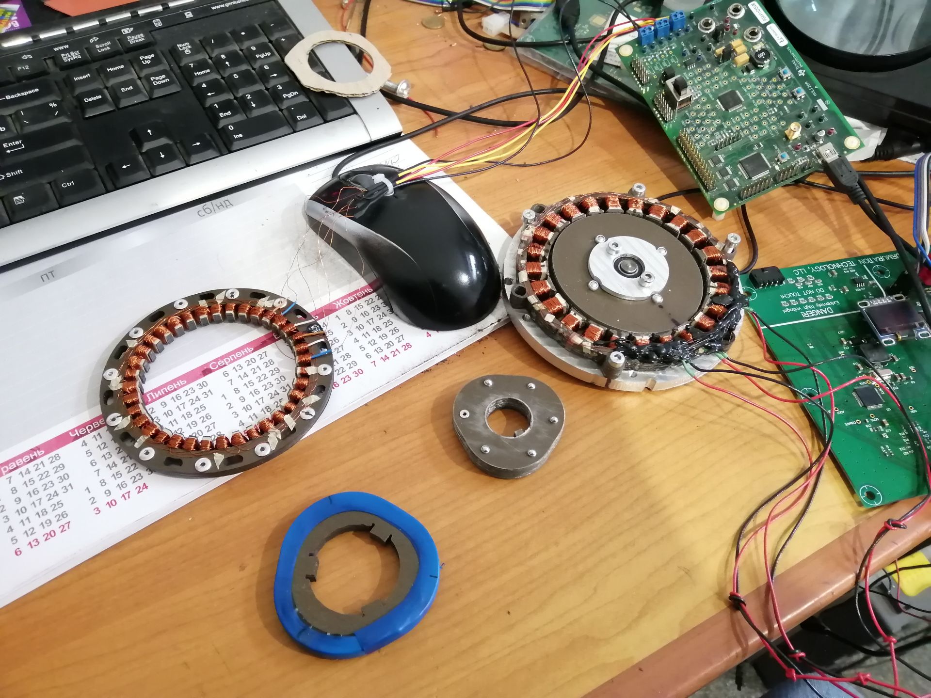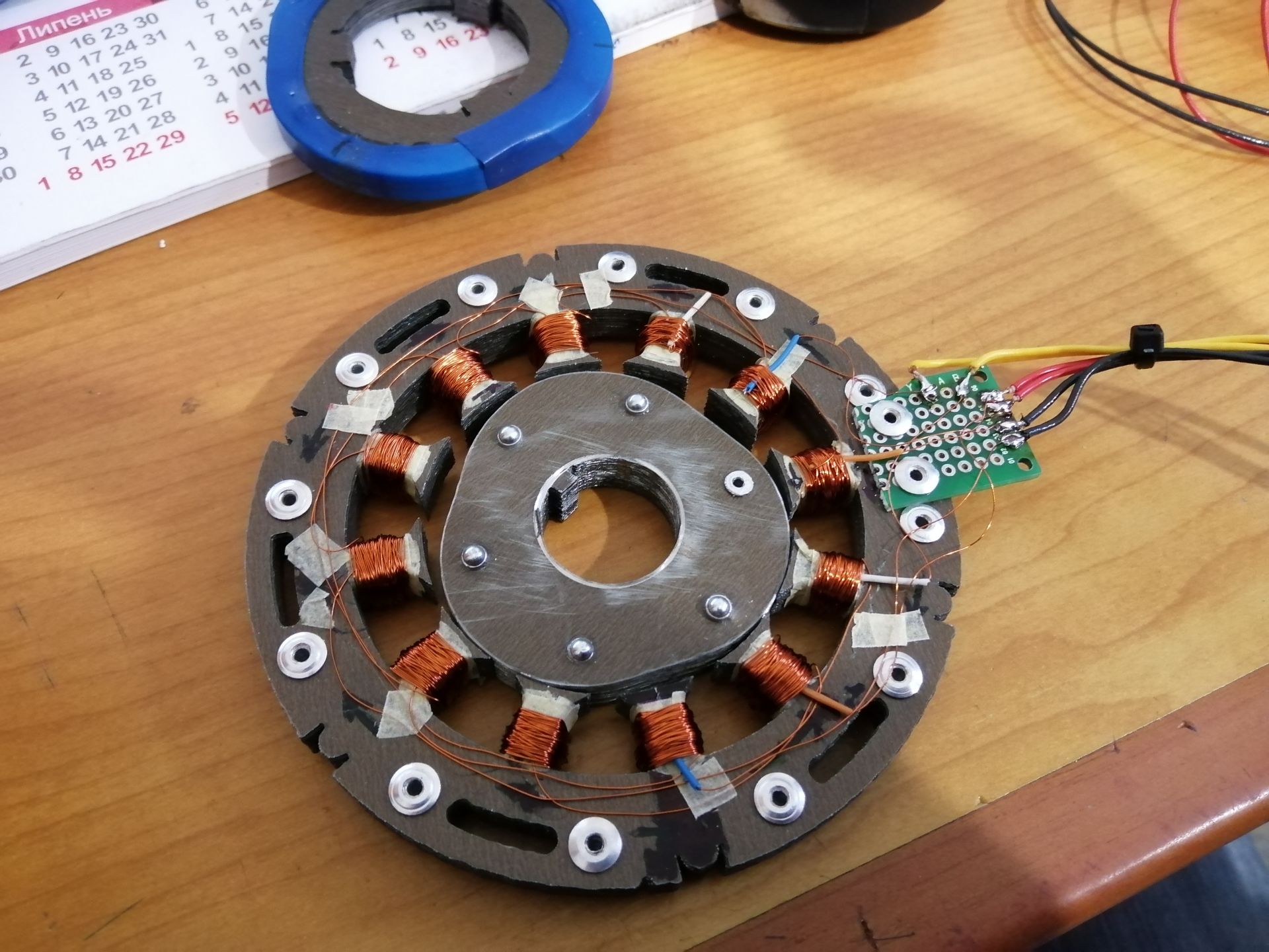 Сейчас смотрю на этот мотор, вижу по 1,5 катушки на зуб, и закольцованную обмотку, что говорит о том что вероятно будет соединение в треугольник и никакой независимой коммутации фазных обмоток не предполагается (и вместо пауз тока в нужных моментах будут обрывки предположительно синуса с переходом через 0), отчего немного становится уныло, ибо максимум из этого железа так не выжать. Возможно я где то не прав, ибо основываюсь лишь на своих скудных базовых познаниях в данной теме.