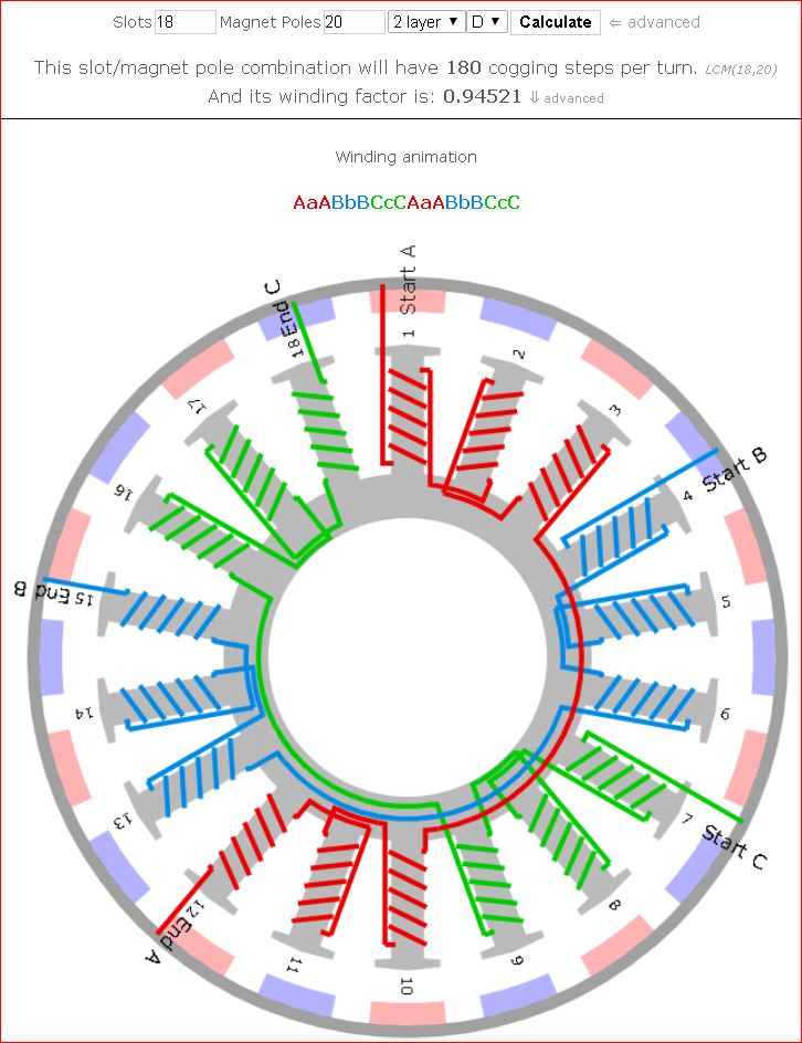 Если присмотреться то можно увидеть, что рядом стоящие катушки одной фазы находятся относительно магнитов с разным сдвигом (на разных электрических углах). А значит и противо ЭДС в отдельных катушках этой фазы будет отличатся на определенный угол. Напрашивается вывод, что подавать в эти катушки ток одной фазы не совсем оптимально (даже при идеальном управлении, в одной катушке ток будет немного запаздывать, а в другой опережать). На самом деле эта модель двигателя (по соотношению магнитов и катушек) явно девятифазная, просто девять фаз это те еще заморочки с управлением (количество ключей и проводов), вот и колдуют с вариантами упрощенных обмоток (объединяя фазы) что бы уложится в классические 3 фазы.