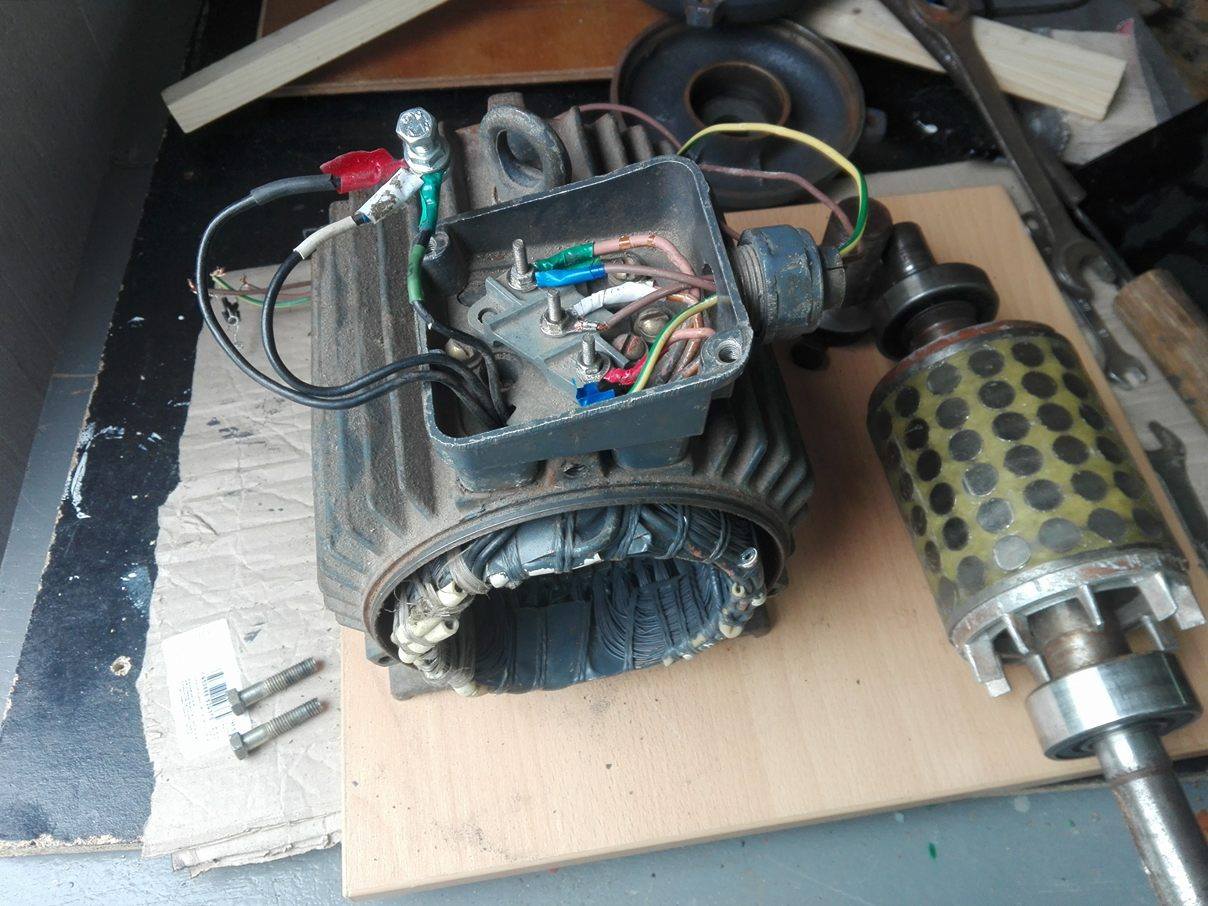 Асинхронный электродвигатель 1,5 кВт переделанный в генератор. На ротор приклеено 96 неодимовых магнитов. Обмотки статора не тронуты, имеют сопротивление 4,3 Ом. Подшипники в норме.