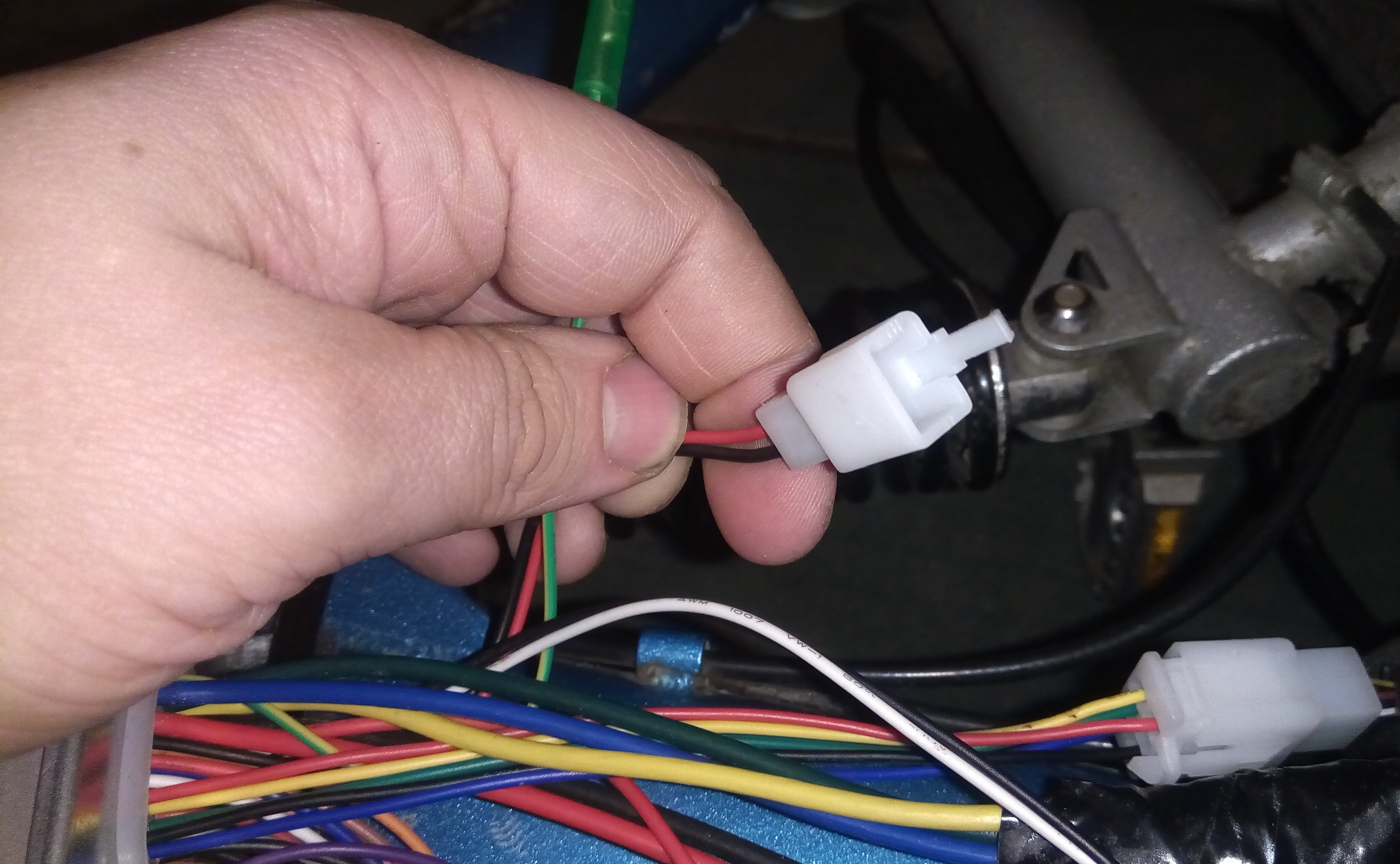 Із Ваших фото: роз'єм 2-х піновий (папа) червоний та чорний - це живлення для сигналізації, 4-х піновий роз'єм (мама), три провода (оранжевий, синій, коричневий) також для сигналізації, блокування МК. Одинарний фіолетовий провід - це високовольтні гальма. Тонкий зелений провід на спідометр.