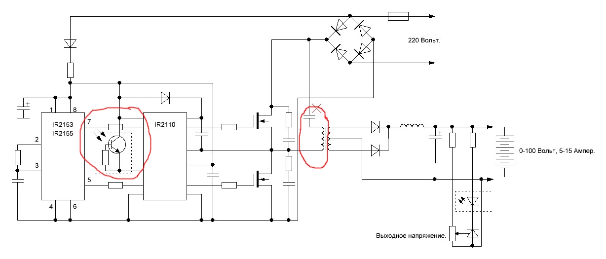 Так как зарядка предназначена в основном для обладателей самодельного транспорта, и желающих сделать самим сей девайс (карман не бездонный - а в попервах возможны и дым и пламень) - чтобы не было преждевременных инфарктов и разочарований схема будет идти на упрощение и удешевление (отказ от IR2153 и IR2110).