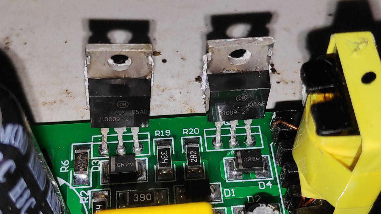 снова разобрал и похоже сгорели транзисторы с одной стороны,так как с другой греются при подключении к 220в.