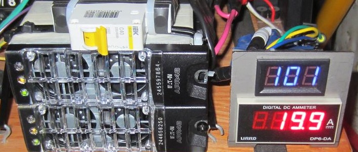 Я заряжаю так: включаю последовательно подключенные зарядные EATONы в сеть, жду пока они стартуют и заряжают конденсаторы, на контрольном вольтметре вижу общее напряжение, после чего автоматическим предохранителем на 40 А включаю батарею на зарядку. Разница напряжений максимальная 30 Вольт, ток - 20А. автоматический предохранитель один раз поменял, но он несколько лет прослужил, начал вышибаться от перегрева, т.к. на одном из контактов на нем видимо ослабла затяжка. Если так не делать, а оставить автомат включенным, и сунуть зарядки в сеть, то они не стартуют мигая красными лампочками и не могут выдать напряжение , но пытаются, иногда получается.