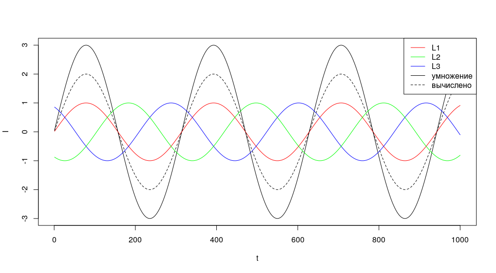 Черная — синусоида как бы получалась при умножении L1 на 3, пунктиром вычисленная по угаданной формуле I₁ - I₂ - I₃, очевидно дальше делим на ⅔ и получаем как нужно, это решаемо уже в прошивке калибровочным коэфициентом. При нулевых I₂ / I₃