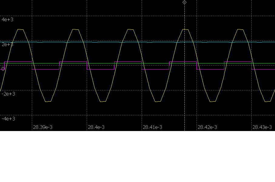 Фази совпадають (жовтий колір - струм у мості, розовий - комутуча напруга моста) - тобто резонанс.